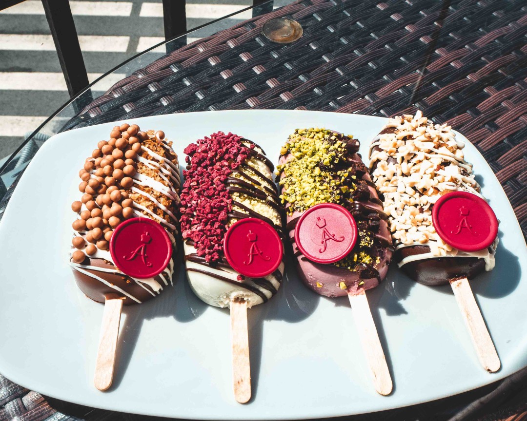 Между входом в отель «Англетер» и «Астория» на почетном месте открылся магазин – там, где в советское время работал буфет, который из-за узкой двери называли «Щель». Для меню магазина шеф-кондитер Юлия Иванова подготовила фирменные эскимо на палочке – от классического ванильного, покрытого белым, молочным или темным шоколадом, до авторских лакомств: мороженое в белом шоколаде с сушеной малиной и мятным крамблом; в молочном шоколаде с хрустящими шариками из соленой карамели; в темном шоколаде с лесными орехами и миндалем; и, наконец, в уникальном руби-шоколаде с кусочками брауни и фисташками. Летий список дополняют домашний холодный чай и лимонады.