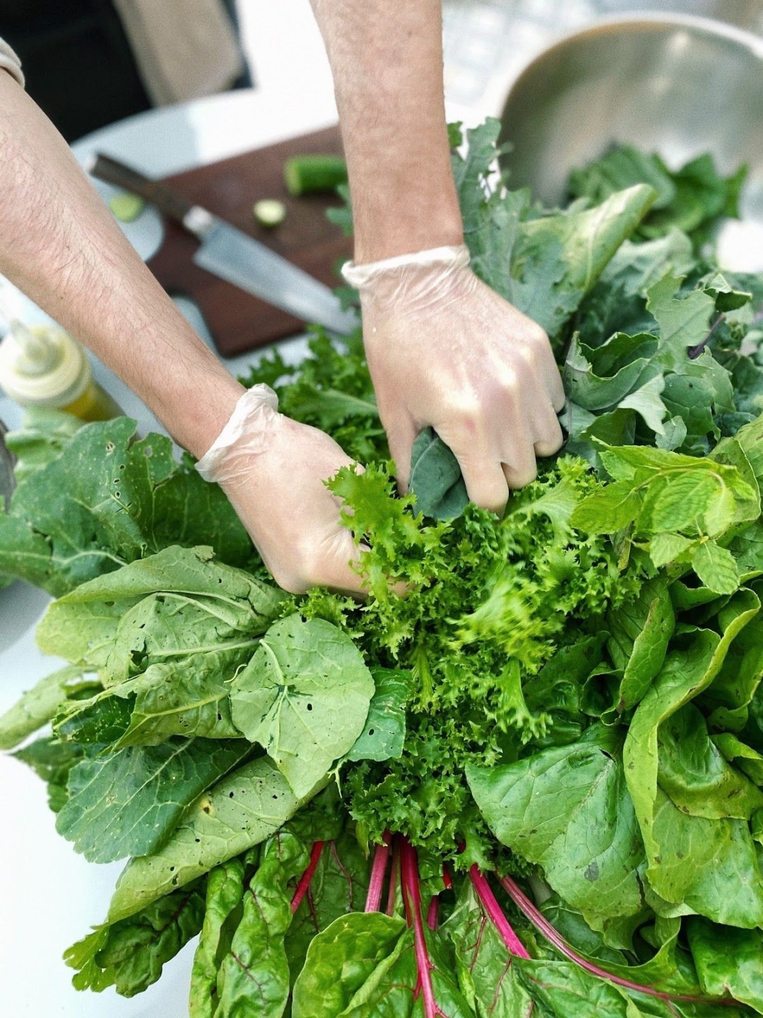 Зелень, овощи и ягоды поступают на кухню с фермы. Шеф-повар Animals Александр Пименов каждый вторник ездит в Псковскую область отсматривать грядки, теплицы и кусты с плодами на ферме, отбирая свежие помидоры, огурцы, перцы, укроп, петрушку и смородину. Многие сорта салатов и овощей в России найти сложно: их вырастили из французских семян, которые шеф успел заказать до карантина.