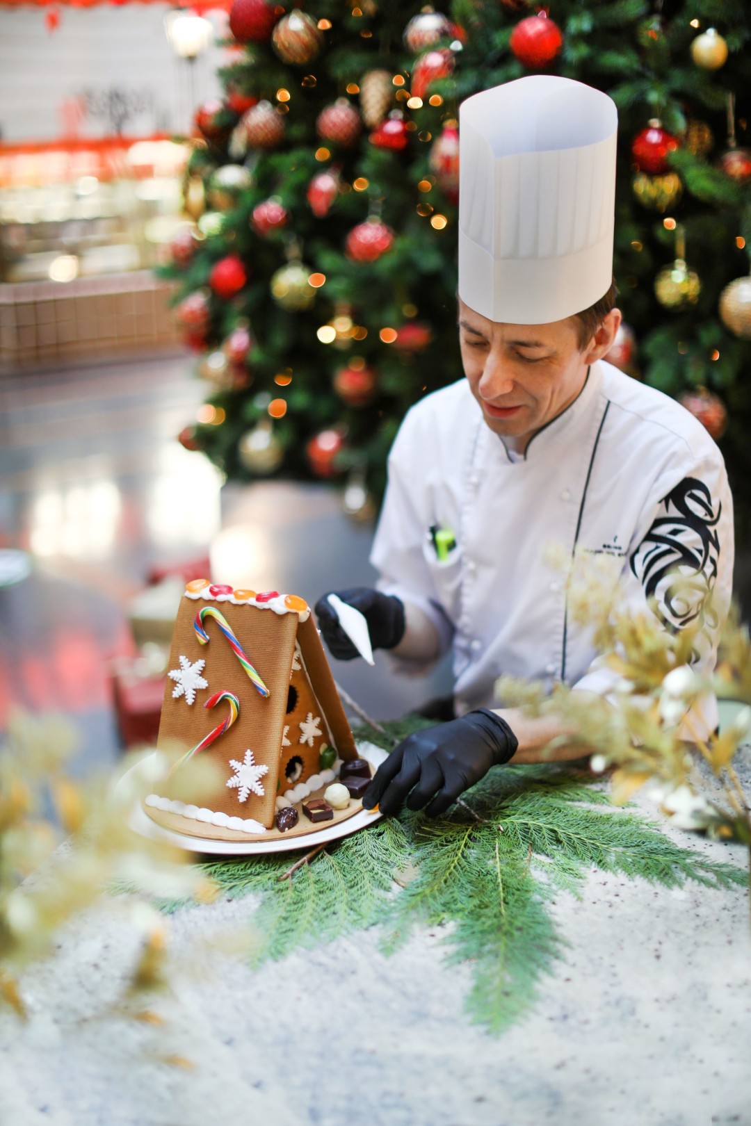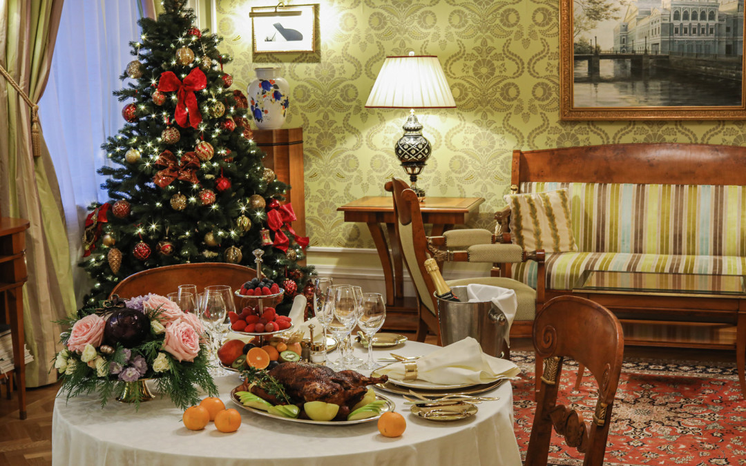 Для домашнего новогоднего стола можно заказать специальное меню от шеф-повара отеля Сергея Андреева. В него вошли почти тридцать блюд, включая закуски, горячее и десерты. Среди блюд целиком жаренный гусь, утка с тушеной бургундской капустой и брусничным соусом, утка по-пекински с блинчиками и кисло-сладким сливовым соусом, рождественская ветчина в медовой глазури, фирменная кулебяка с балтийской форелью и ладожским судаком, три вариации салата «Оливье» с копченым осетром, отварным говяжьим языком или индейкой, молочный поросенок, фаршированная стерлядь. 31 декабря для гостей отеля, которыми могут стать и петербуржцы, будет приготовлено три вида новогодних сетов. Подаваться они будут в номер.