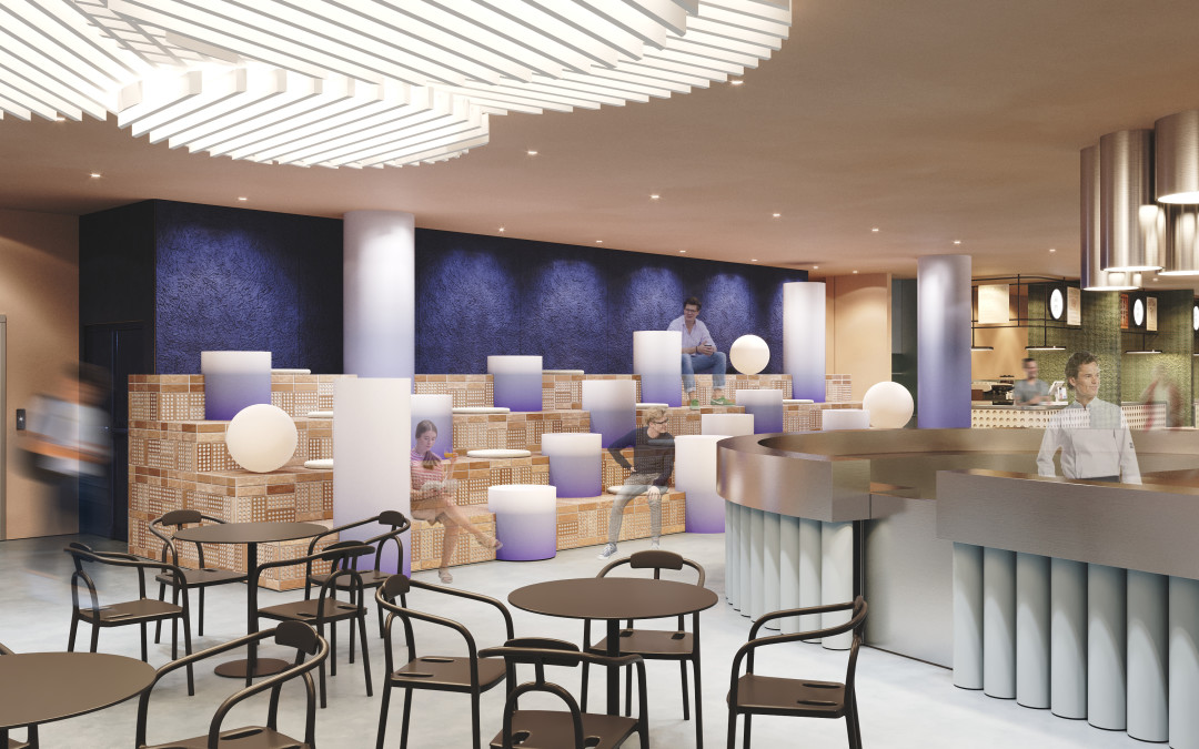 Дизайн интерьера разрабатывало бюро Юны Мегре Megre Interiors («Скоро весна», «Юность»). В оформлении будут использоваться разные текстуры: дерево, кирпич, мозаика и металл. Вход с комплекса будет лаконично оформлен с помощью интерактивной панели. Цветные округлые модули можно использовать в качестве сцены или сидений. Лампы, имитирующие дневной свет, создадут ощущение атриума. Многоуровневая посадка для гостей со столиками — творческая инсталляция и «food working».