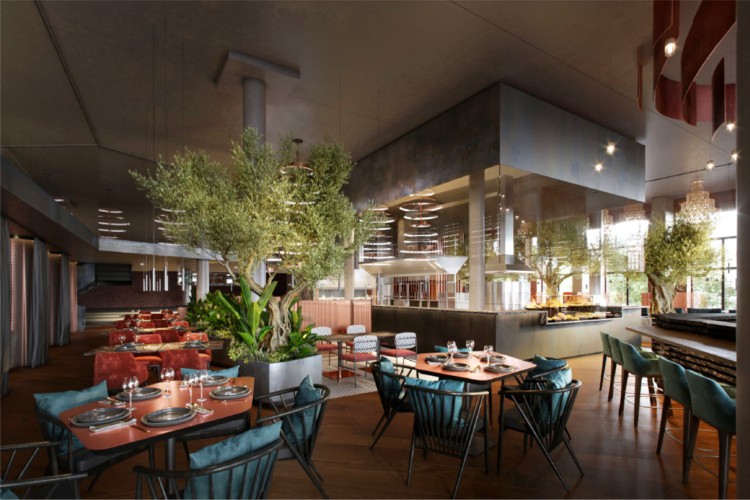 Ognivo окнами выходит на внутренний сквер с фонтанам, а внутри заведения — столетние трехметровые оливы бонсай из Италии. Огонь, на котором собираются готовить почти все меню, будет гореть на открытой кухне в центре ресторана.
