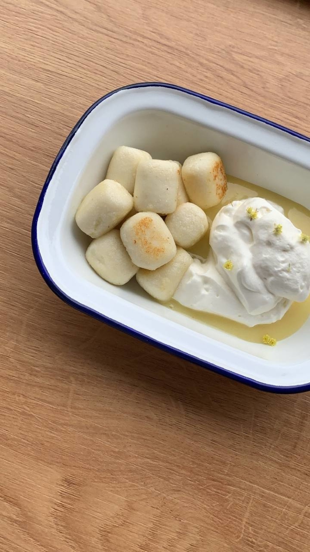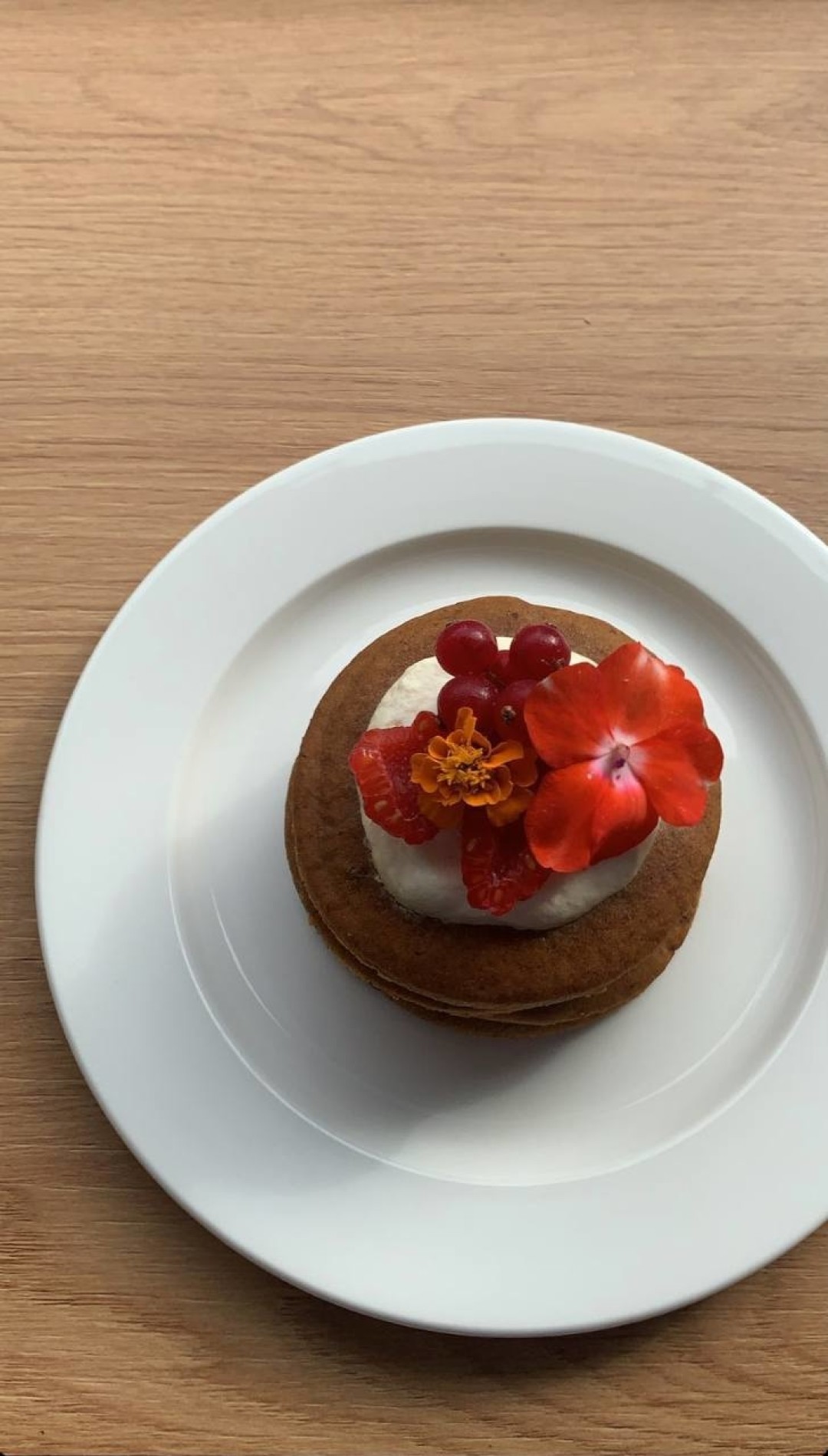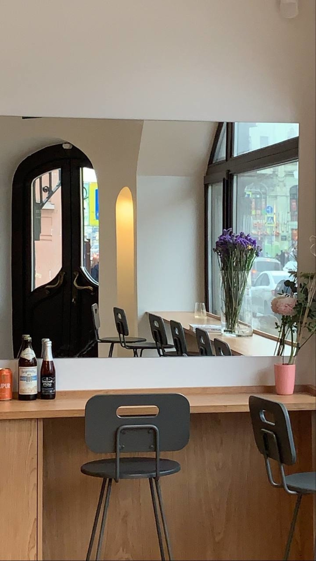 На первом этаже функционирует спешелти-кофейня с небольшим меню от Ксении Стародубцевой: авокадо на хлебе с лососем, шелковый омлет, ленивые вареники из творога с лимонным курдом и сливками, медовая гранола с миндалем, пеканом и тыквенными семечками. На десерт медовый торт с ягодами, лимонный кекс на оливковом масле и канеле.