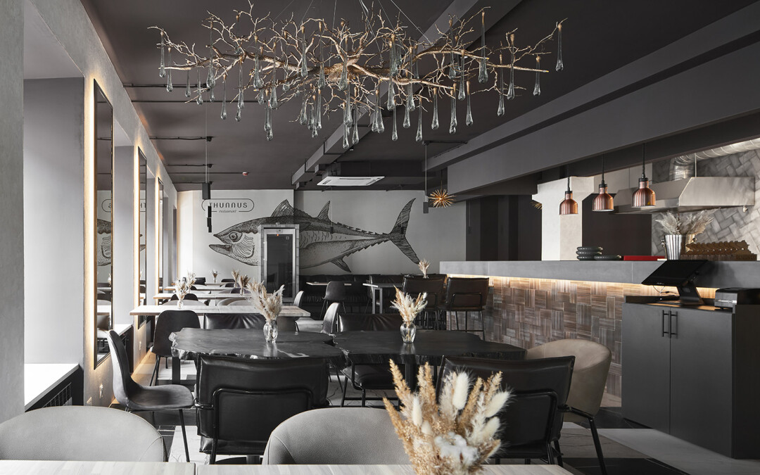 Дизайн ресторана разработала создательница Thunnus Елизавета и ее дизайн-студия MD&D (Mobiliz Design&Decor). Главная точка притяжения интерьера — впечатляющая люстра в виде золотой ветви с кристаллами. Но на этом авторские акценты не заканчиваются: декоративный стол из старинного спила дерева, которое выловили в одной из рек Марий Эла и покрыли эпоксидной смолой, можно считать местным арт-объектом. К слову, пол в Thunnus имитирует мрамор, а главный элемент на стене просторного зала – изображение тунца. В следующем сезоне при ресторане откроется летняя терраса.