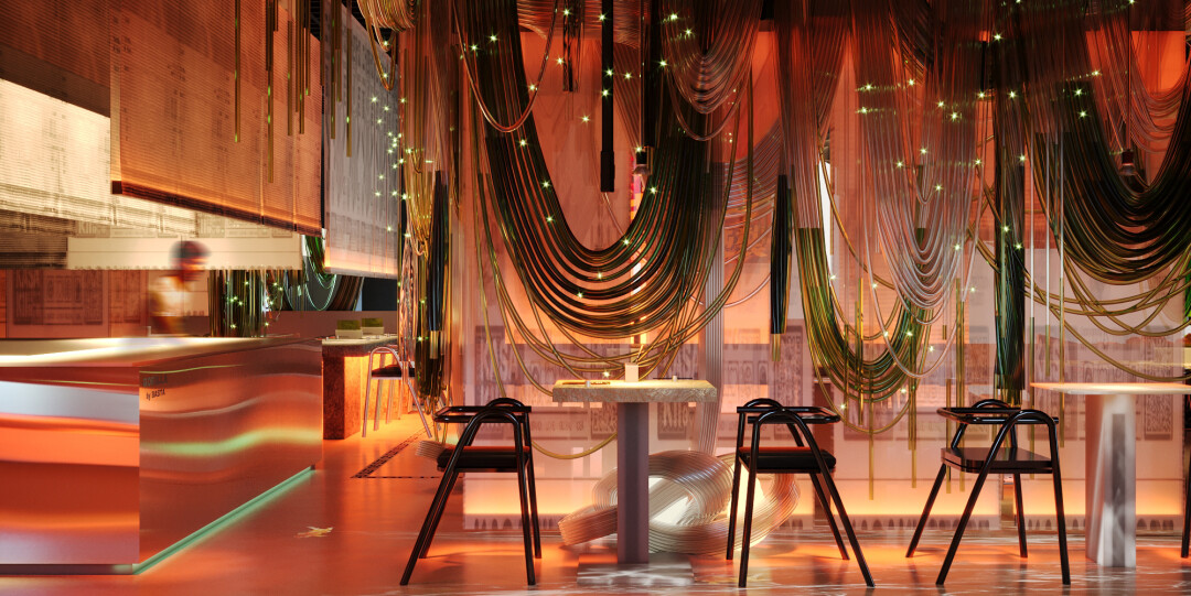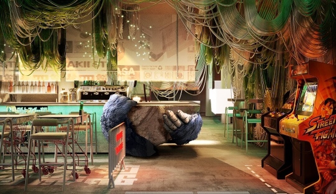 Интерьер архитектурного бюро DA Bureau (Birch, Bio My Bio, Cococo Bistro и кластер Third Place) погружает в другую вселенную сочетанием японских комиксов Кайдзю и футуризма, игровых автоматов и золотых лиан. Пластиковые джунгли, теплый оранжевый и зеленый свет, металлическая фурнитура и лапы гориллы говорят о концепции: на Земле произошла катастрофа, человечество уничтожило себя и большую часть жизни на планете.