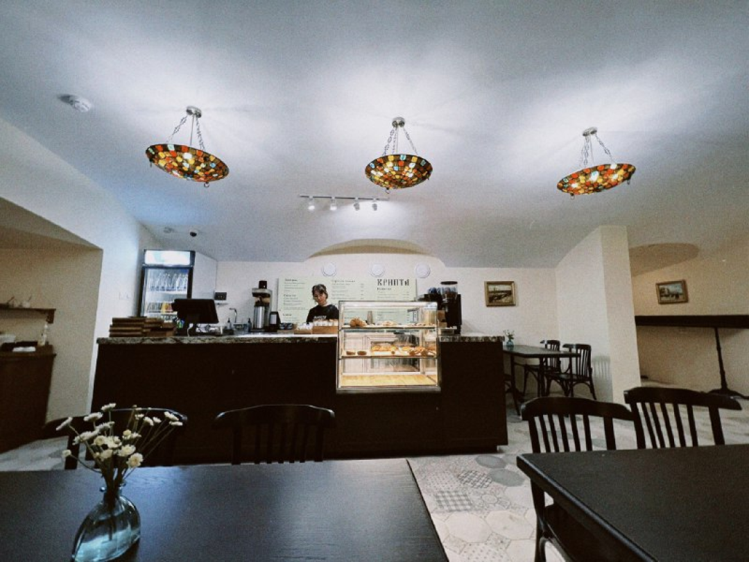 Заказ нужно делать у кассовой стойки — простое меню с демократичными ценами здесь же (выпечка от 50 руб., горячее до 270 руб.). Все пирожки, слойки и булки пекут сами — для кафе специально построили пекарню в соборе. На завтрак готовят тыквенную кашу, омлет и сырники, из основных блюд в «Крипте» можно заказать бефстроганов, пожарскую или щучью котлету, оливье с бужениной. В разделе супов — окрошка на квасе, борщ, солянка и уха из белой рыбы.