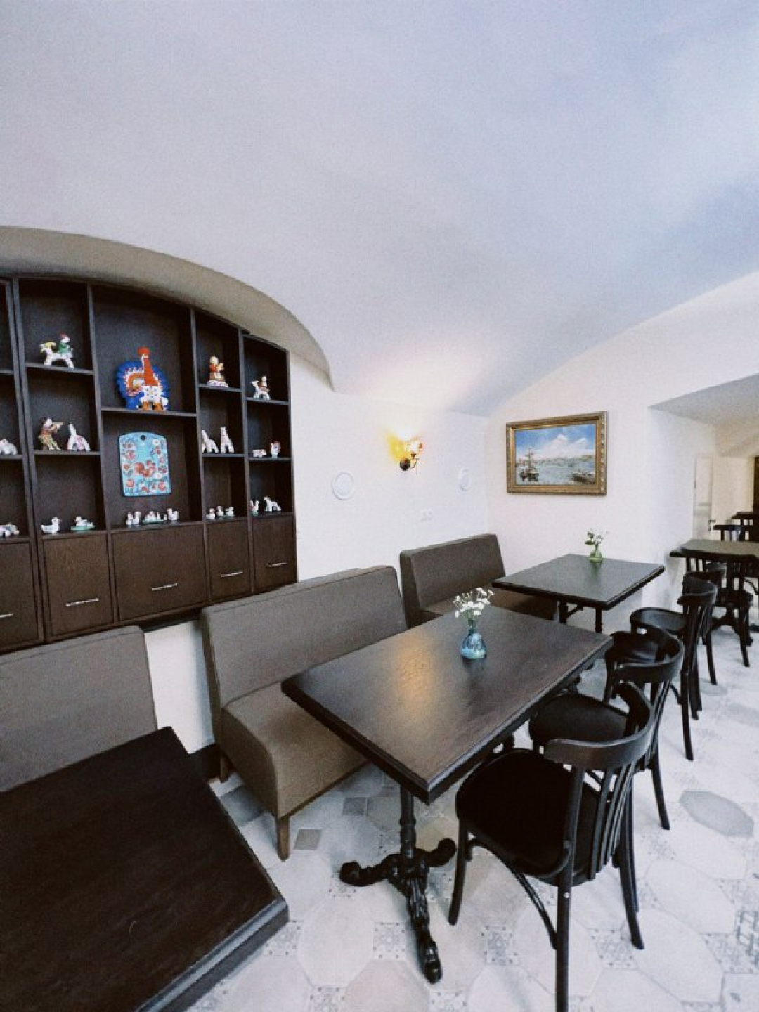 Небольшое заведение расположено в сводчатом помещении под молельным залом. Зал со светлыми стенами украшен светильниками с цветными витражными стеклами и картинами, а на одной из стен есть стеллаж с коллекцией фарфоровых расписных фигур.