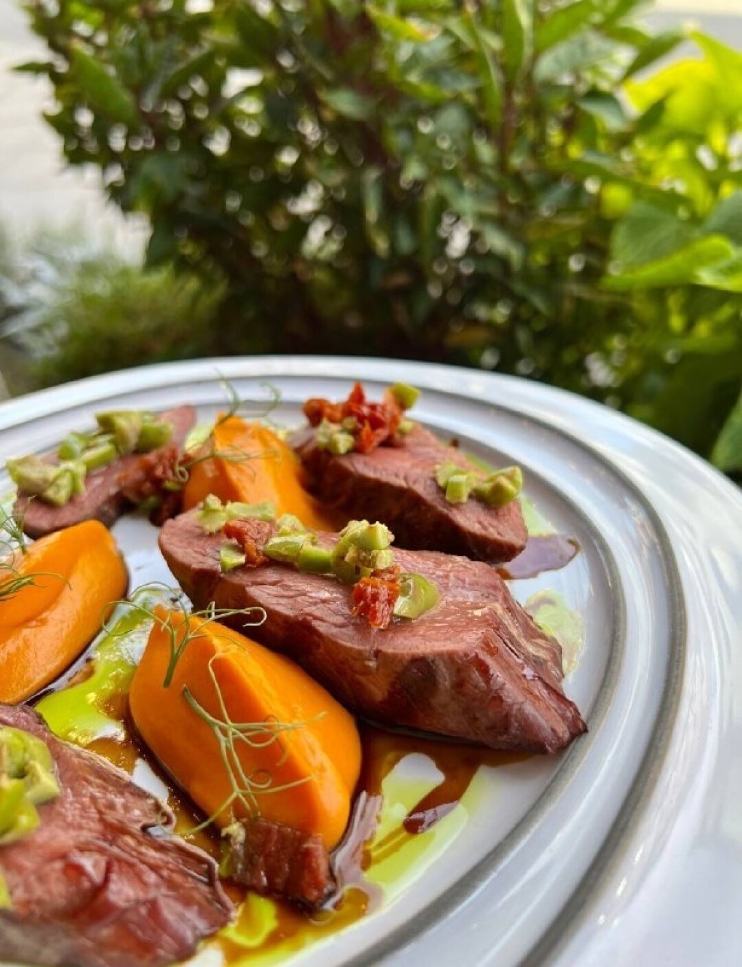 Шеф-повар Вячеслав Гнедовский приготовил несколько блюд из мяса черного африканского страуса: голубец с фуа-гра, мясо птицы с кремом из печеного батата и рубен сэндвич с пастрами. Такое мясо отличается низкой калорийностью — всего 97 ккал на 100 гр — и рекомендовано для правильного питания.