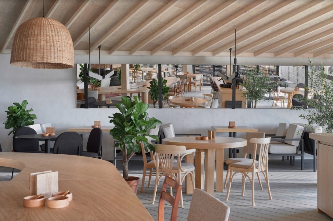 Интерьер загородного проекта разрабатывало архитектурное бюро Da Bureau (Cococo Bistro, Osteria Betulla и Birch), взявших за референс греческий стиль острова Миконос. В отделке использовали много дерева, а на потолке открыли балки кровли. Здесь открытая кухня, из каждого окна виден Финский залив, есть обогреваемая терраса, которая переходит в уличную веранду с садом, галькой и шезлонгами.