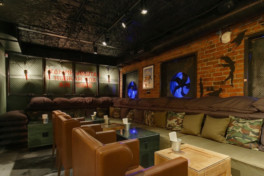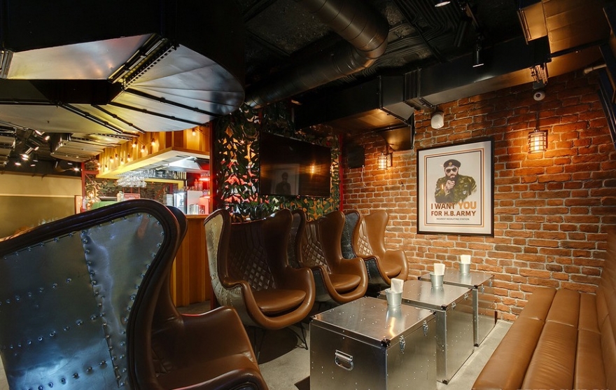 Второй ресторанный проект от Art Hookah Family - первый находится на Дмитровском переулоке - сохранил армейскую тематику в интерьере. Образ американского военного штаба подчеркивают авиационные акценты: винты в оконных проемах, иллюминаторы с видеорядом полета, сервировочная тележка, как в самолете, и тематические граффити. Попасть в Hookah Box Aviator можно строго по личному коду, который гость получает на сайте после заполнения небольшой анкеты.