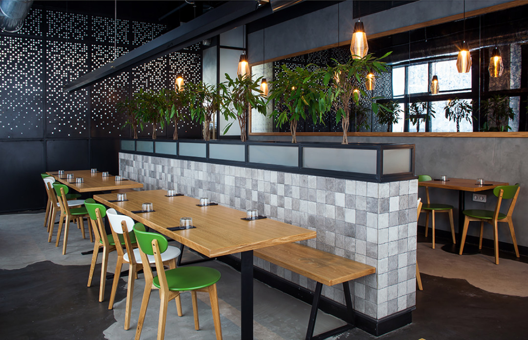 Оформлять интерьеры снова позвали Юрия Федорова – получилось открытое пространство в сдержанном скандинавском стиле. Те же цвета, натуральные растения и металлические конструкции по центру зала, только теперь еще и панорамные окна с видом на Аптекарскую набережную и телебашню.