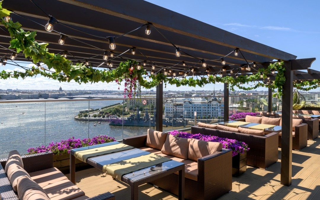На крыше отеля «Санкт-Петербург», откуда открывается вид на акваторию Невы, гости могут послушать живую музыку, устроить свидание с бокалом игристого или организовать банкет на 80 человек. И все это на высоте 60 метров!