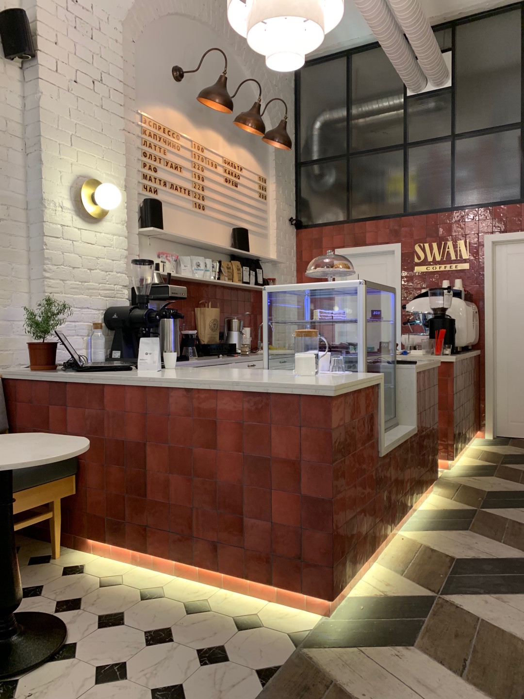 За дизайн кофейни, который тоже построен вокруг танцевальной тематики, отвечал Дмитрий Нил (московская кофейня 8/25). Он декорировал стены SWAN большими зеркалами и поставил балетный станок. Вход в заведение оформлен арочными дверьми, которые — если их распахнуть — создают единое с улицей пространство.