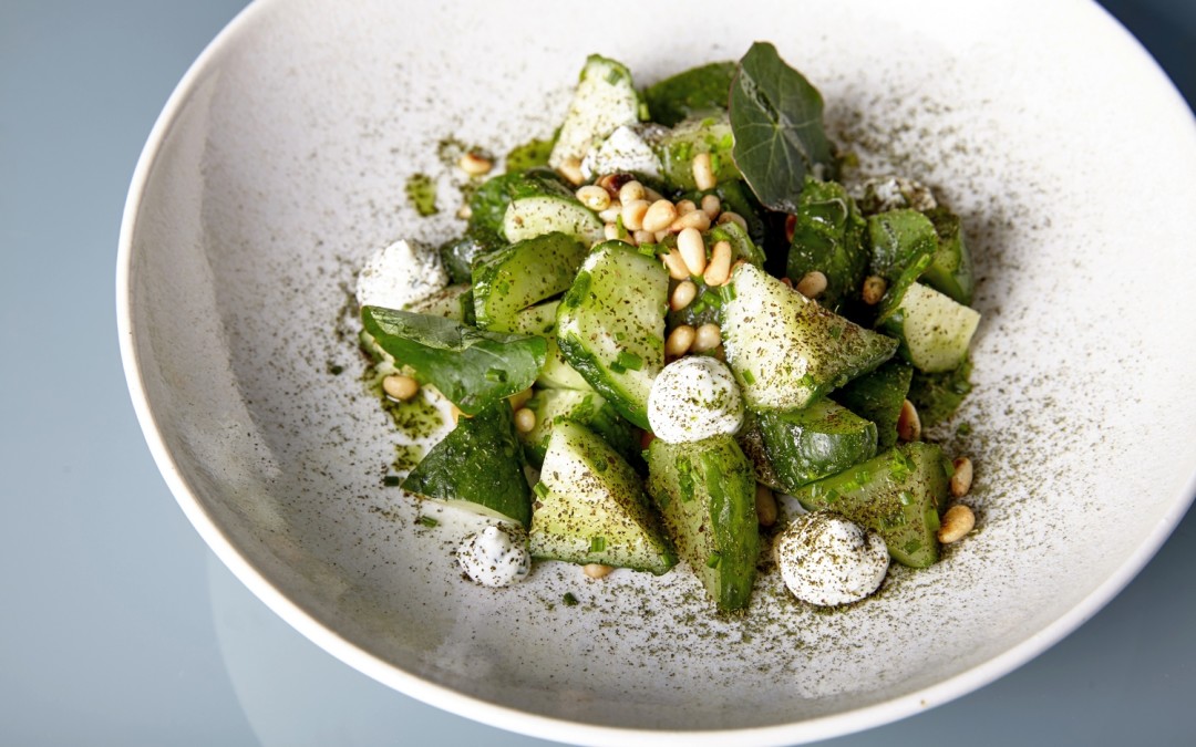 Вам понадобятся 600 грамм огурцов, 15 грамм очищенного чеснока, смесь пряностей «Лимонный перец», 40 грамм кедровых орехов и для мягкого сыра 100 грамм креметте, 30 мл сливок 33%, свежий укроп, лимонный сок, соль и перец. Огурцы моем, обрезаем с двух сторон и засыпаем солью — где-то чайной ложкой с горкой, нарезанным чесноком и «Лимонным перцем». Убираем в пакет, плотно завязываем, стараясь оставить минимальное количество воздуха внутри, и ставим в холодильник на 7 часов. Сыр взбиваем в блендере со сливками, укропом и лимонным соком, соль и перец — по вкусу. Кедровые орехи обжариваем на сухой сковороде с солью, выкладываем на тарелку предварительно нарезанные огурцы, добавляем мягкий сыр и сверху посыпаем орешками. Приятного аппетита!