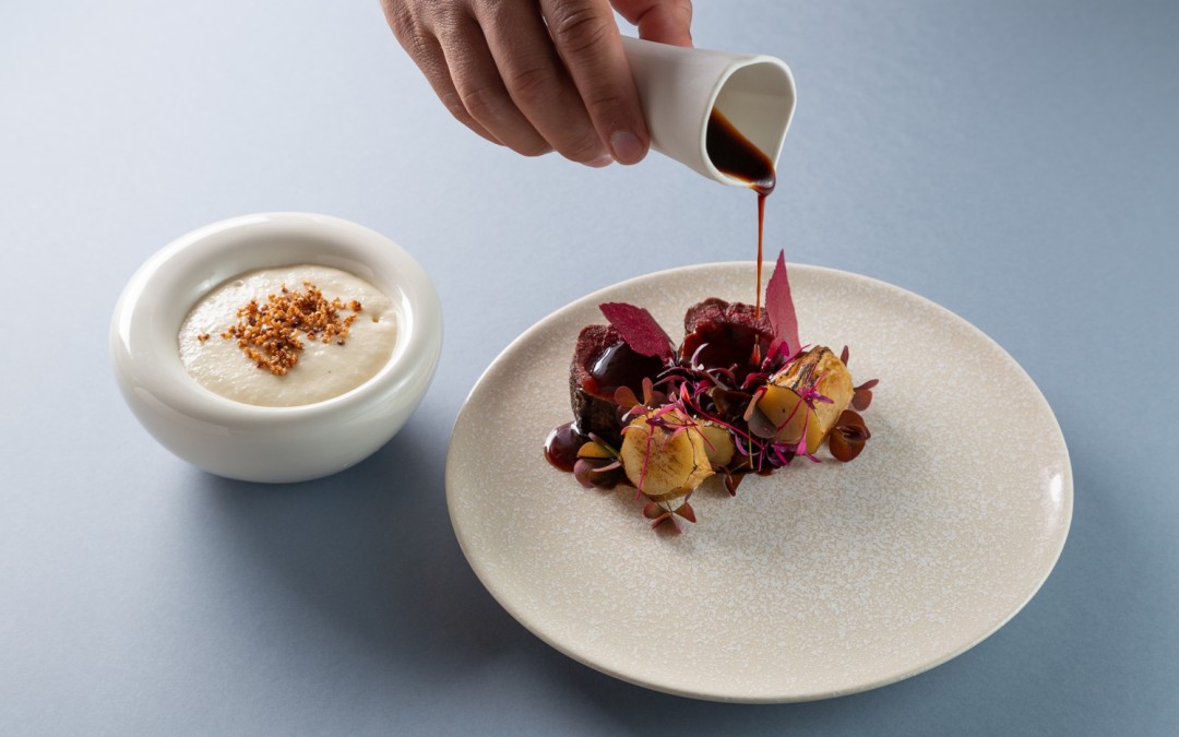 филе оленя с корнем петрушки, манной кашей и попкорном из органического кеноа
