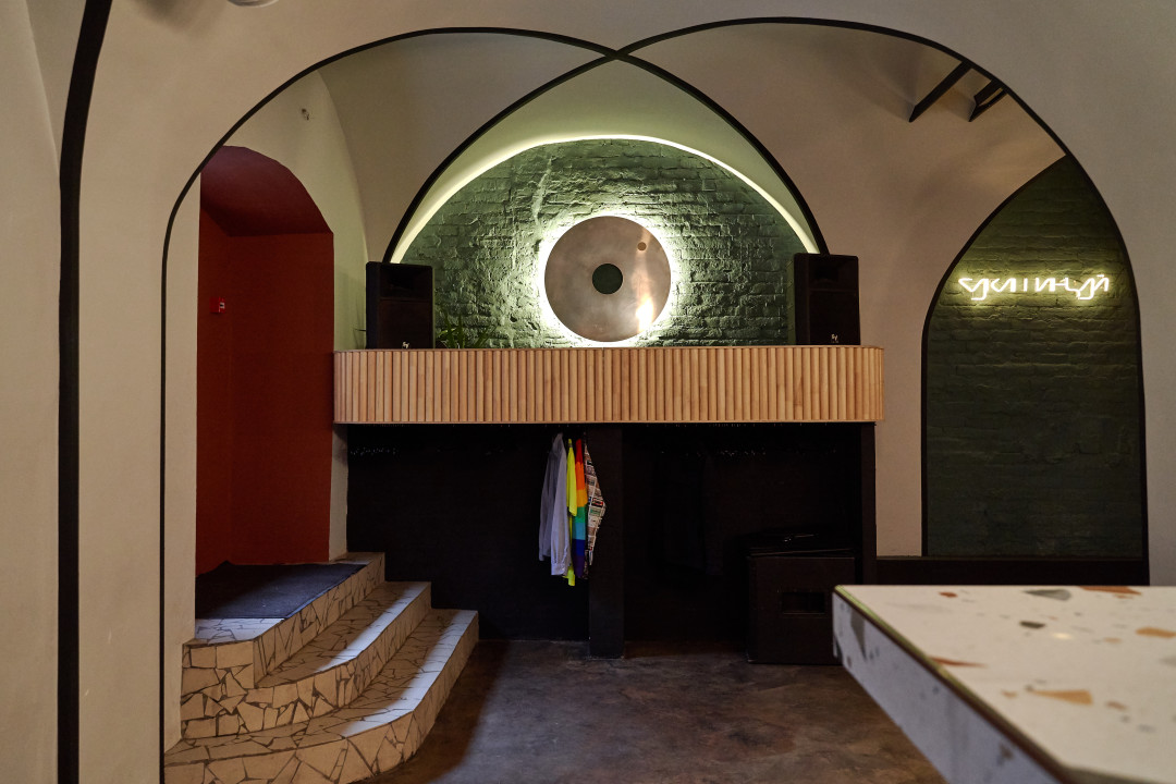 Бару досталось просторное помещение с эффектными готическими сводами во дворе бывшего «Третьего кластера» на 8-ой Советской (когда-то на этом месте располагались кафе Humboldt и бар Prosto vino). Дизайном «Тактов» занималась Майя Губайдуллина, до этого оформлявшая «Цветочки» на улице Некрасова. Некоторую преемственность проектов разглядеть не трудно. Стиль, в котором оформлен бар, можно назвать комфортным минимализмом: натуральные материалы, функциональная мебель, выкрашенные в приглушенный оливковый кирпичные стены, неоновая подсветка и футуристичные люстры, напоминающие диско-шары. Первый, более просторный зал с барной стойкой и диджейской рубкой задуман как пространство для танцев и вечеринок, во втором –компактном и более светлом – установили несколько столов и обустроили открытую кухню: в 2019 году полноценная (и нескучная!) еда стала обязательным атрибутом даже танцевальных баров.