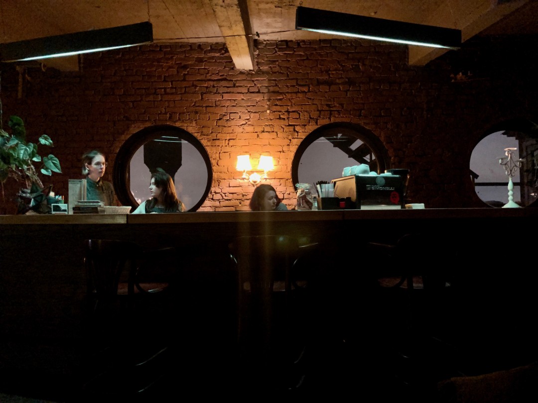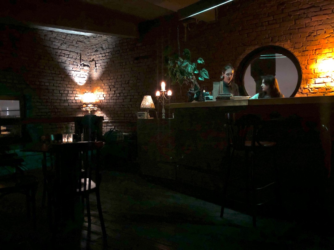 Внутренним оформлением кофейни команда занималась самостоятельно. На первых порах ограничились расчисткой кирпичных стен, укреплением пола, расширением оконных проемов. В дальнейшем в одном из соседних помещений планируется создать концертную площадку, а также обустроить крытую летнюю террасу на крыше.