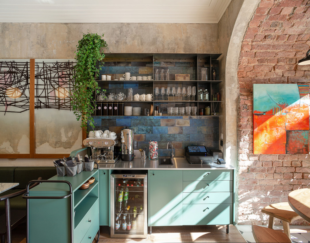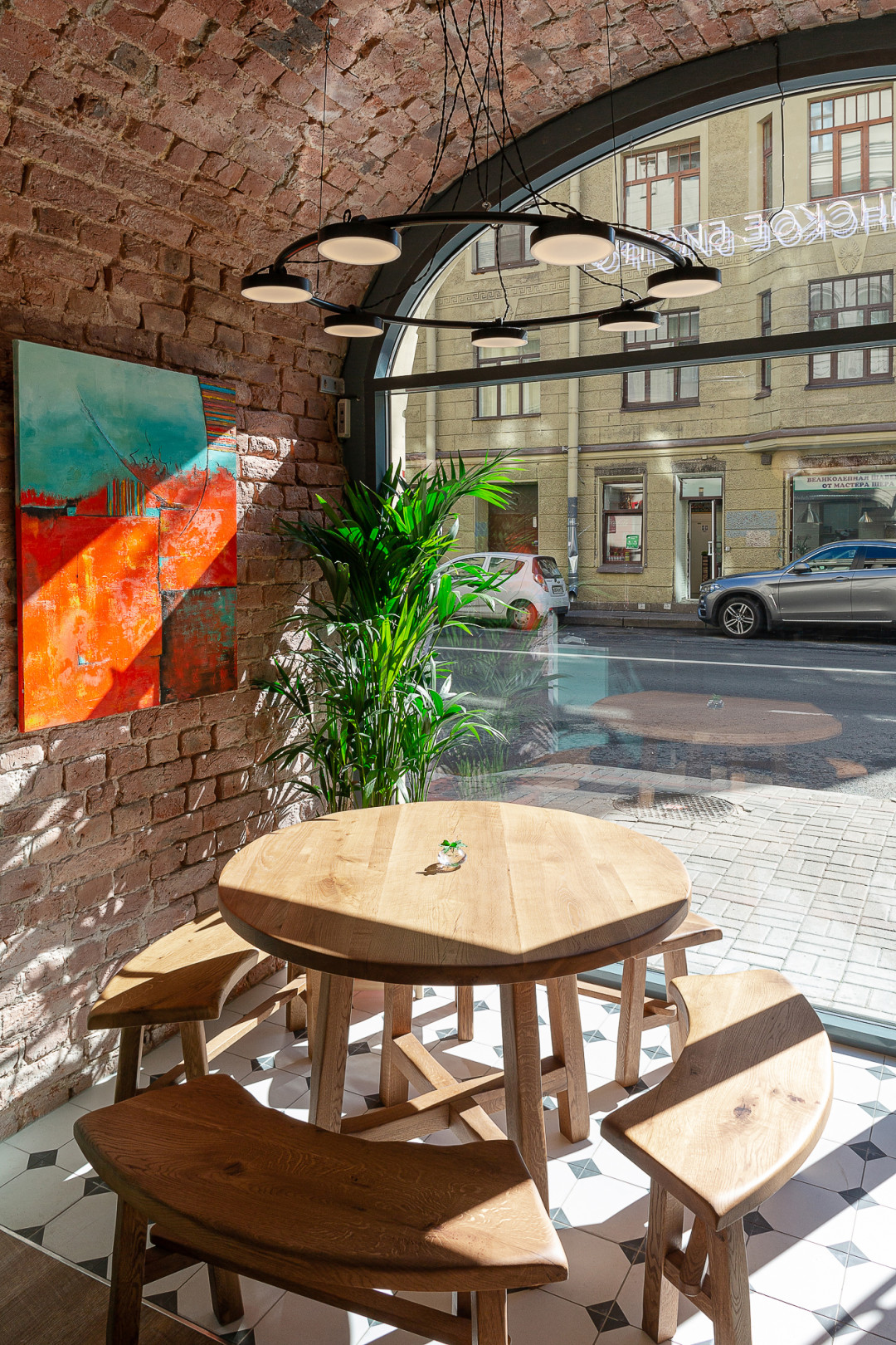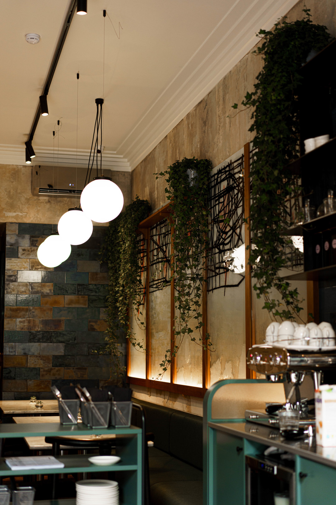 Винную карту создала Анастасия Горбовская, выходец из Duoband и управляющая обоих бистро Georgiani. За дизайн-проект нового заведения отвечало архитектурное бюро Paum, ранее работавшее с Italy на Виленском и «Банщиками». Под их началом в небольшом помещении на 25 посадочных мест появились панорамные окна, синяя плитка-хамелеон ручной работы, которую керамистка Нино Ковалевская обжигала вручную, живые растения и расписанные стены.
