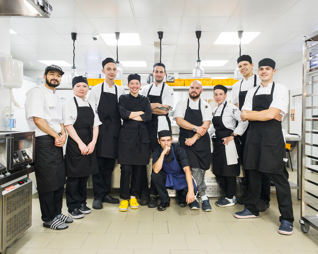 Кухню здесь возглавляет Александр Кокурин, которого давно знают в Петербурге по «КоКоКо», Social Club, мастер-классам и ужинам Haute Cuisine. Александр изучал гастрономическое искусство более 10 лет, работал с признанными шефами Франции и Китая, такими как Ален Дюкасс, Кок Леонг Тен, Андрэ Аккорди. В этом проекте он собрал поваров с большим бэкграундом и опытом. Попадая на кухню, слышишь, что команда использует только ресторанный лексический ряд: гости, стол (а не заказ), есть, конечно, и доска с планами, и стоп-лист, который обновляется каждый день. Сразу бросается в глаза: иерархия на кухне та же, терминалогия та же, станции те же – это точно не доставка, потому что само мышление лежит в области классического ресторана и традиции исключительного вкуса.