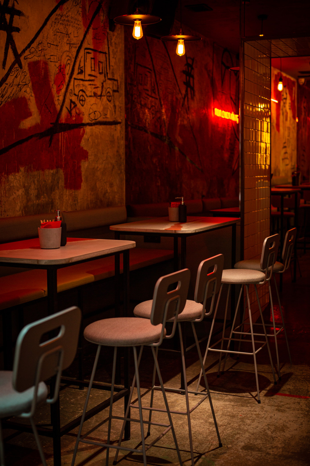 Еще один проект на Петроградской — гастробар с неоновыми инстаграмными вывесками — открыли Иван Суворов, Вадим Громов и Илья Лопушек. Хабаровский художник Иван Шкулипа расписал бетонные стены яркими рисунками и символами. Меню кухни разрабатывал Виктор Гусев, в портфолио которого «Мечтатели» и новое бистро «Тени». Главный израильский специалитет — хумус — здесь с садовой морковью и семечками, шварма с цыпленком и хумусом из кукурузы, крем из кукурузы подают с лангустинами, а лосося – с печеным баклажаном и проростками. Коктейли придумывала Юлия Махнева, которая осталась с предыдущего проекта — бара Lure. В составе необычный крепкий алкоголь, пряные специи и травы: твист на гимлет с джином на оливе и кордиалом на тимьяне или микс с текилой на ягодах брусники, Саган-Дайля и тысячелистником.