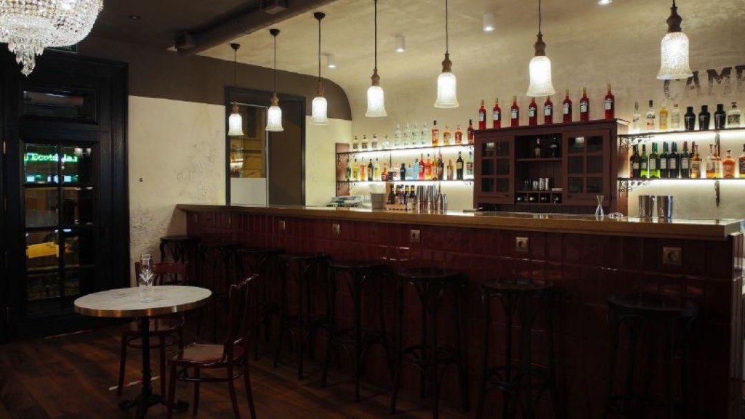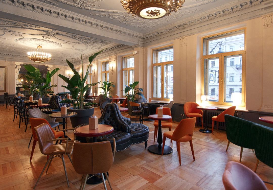 Четвертый винный проект от «Рафаэлов и Ко» находится в самой центральной локации Петербурга: доходный Дом Палкина на Невском, 400 (!) квадратных метров и 128 наименований бутылок. Паркет отреставрировали, заказали зеркало, которому 200 лет и оставили исполинские старинные люстры — Кира Гришина («Дом быта», «Подписные издания», «Мерула.Винный двор») нашла баланс между исторической отделкой с золотыми подсвечниками вдоль стен, современной мебелью под заказ и зелеными живыми растениями. В меню от Андрея Антипина выделена отдельная глава для сырого — устрицы, сашими, тартар и два вида севиче. Еще 8 разделов с брускеттами, стартерами, супами, горячим, пастой, ризотто и десертами. Пробуйте хамон с луковым соусом, краб с томатами, чаудер с беконом и лососем и сливочное ризотто с тартаром из говядины и перепелиным желтком, которое подается во всех проектах бренда. Все сыры, используемые в блюдах – буррата, сулугуни, страчателла, пармезан – производятся на фермах неподалеку от Петербурга.