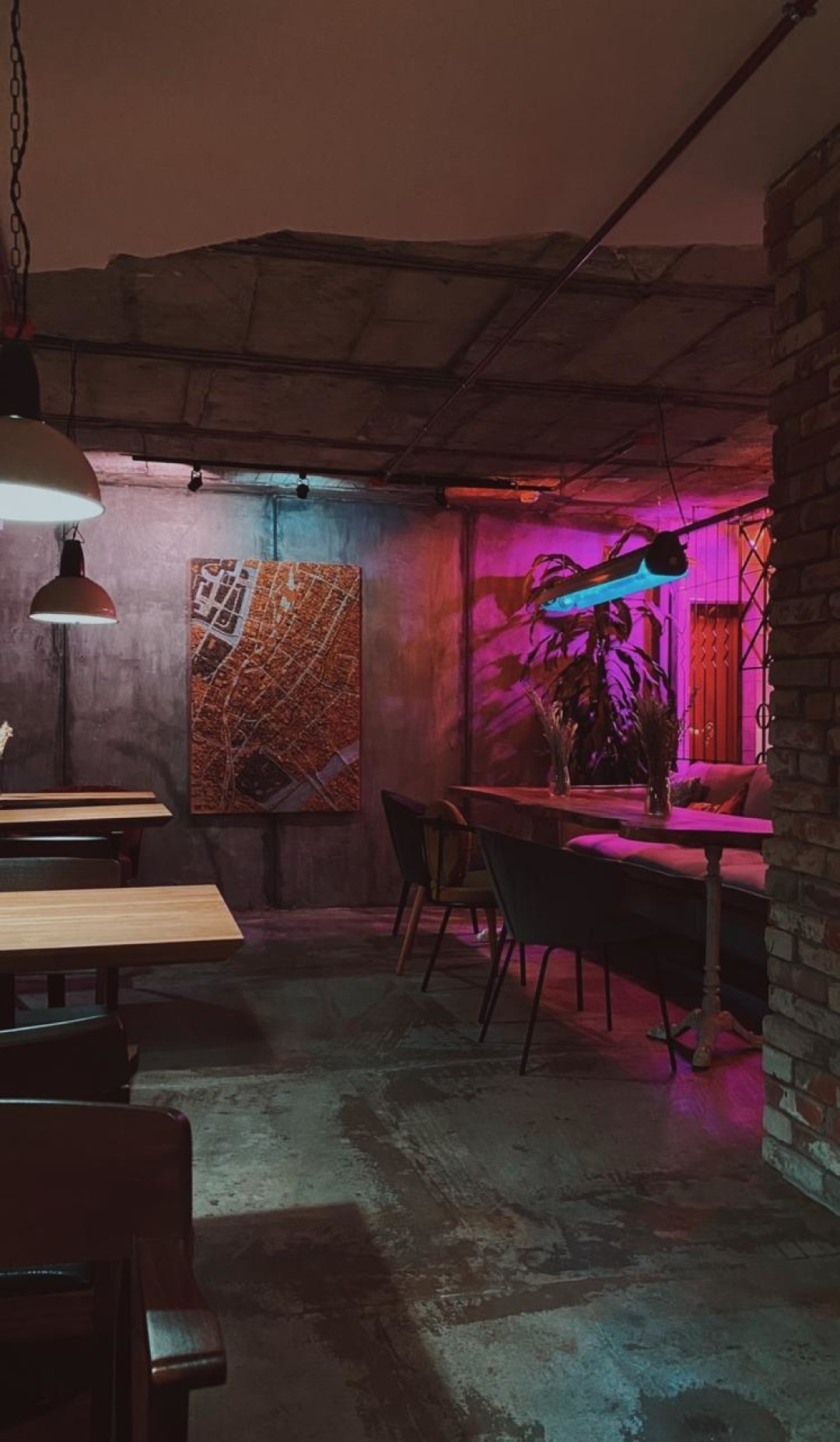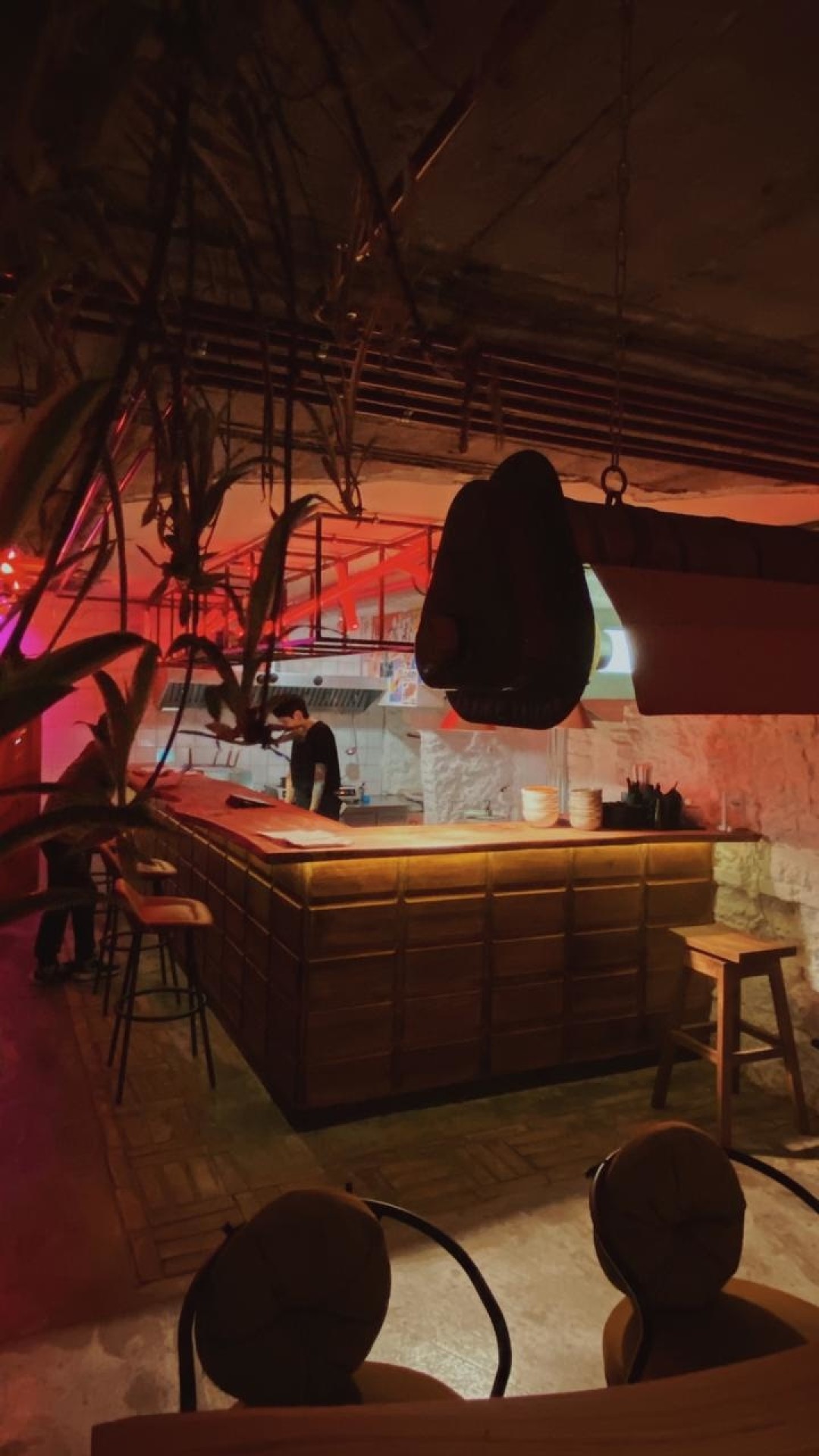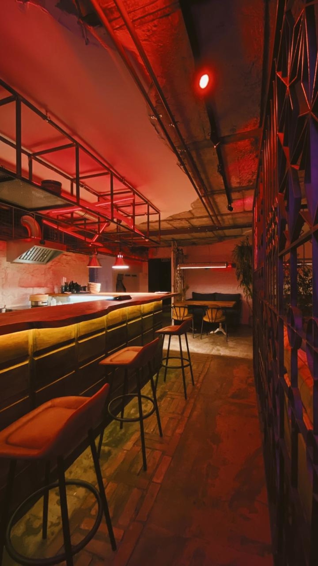 Рамен-бар — это двор-колодец с японской сливой и провокационным стрит-артом на тему шибари: место для музыки и встреч за большими столами; арка-сад с контактным баром и основной зал «полуспикизи», напоминающий японскую опиумную комнату с тягучим красным светом. Всего на 160 квадратных метрах поместятся 52 человека.