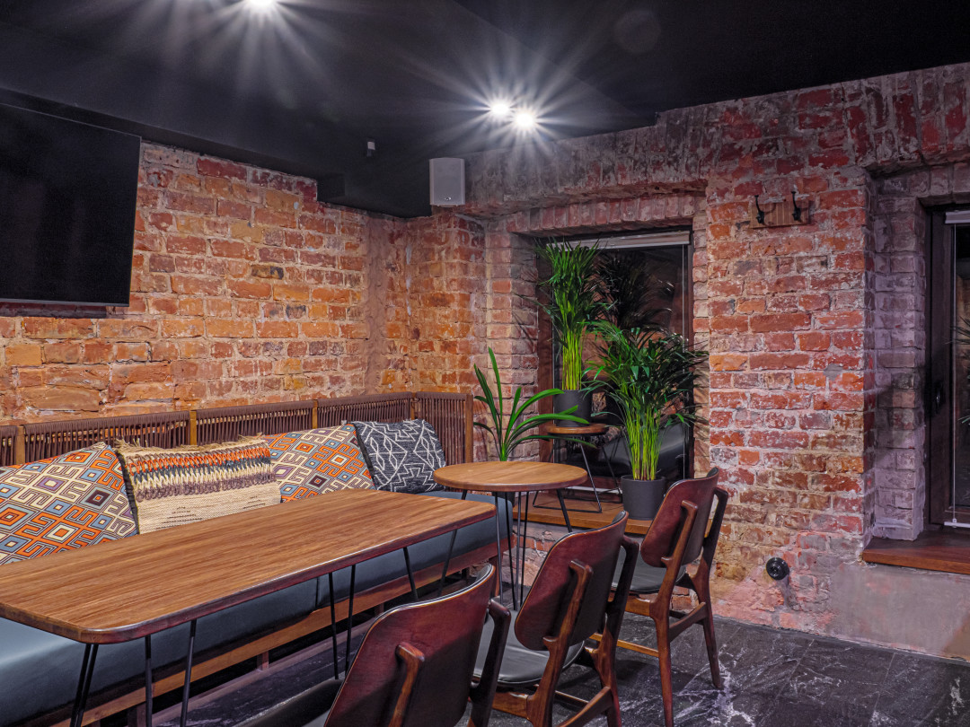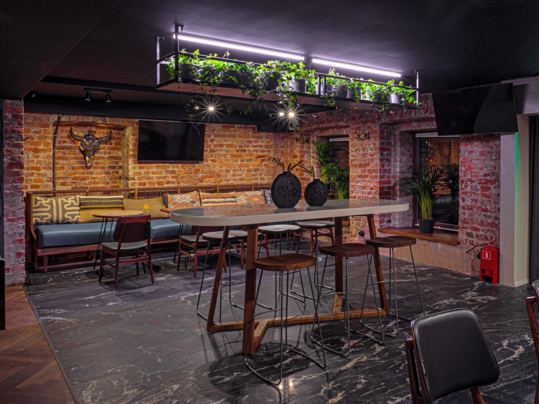Внутри заведения сохранена оригинальная кирпичная кладка дореволюционной постройки. Интерьер дополнен живыми растениями, подушками с этническими узорами, кикером и шахматами.
