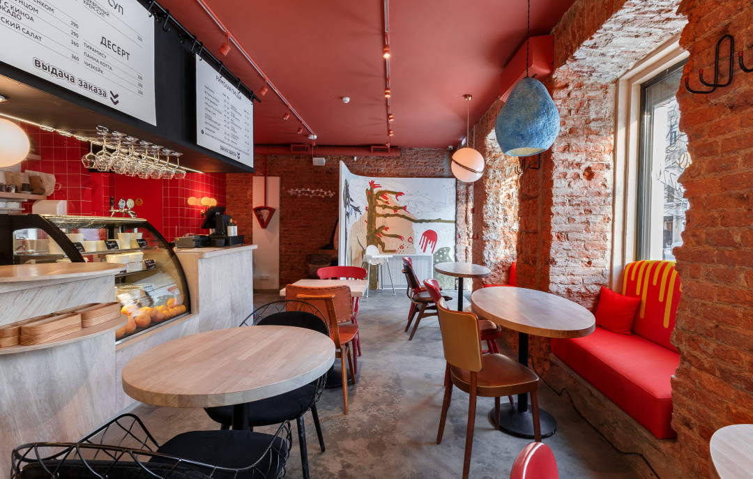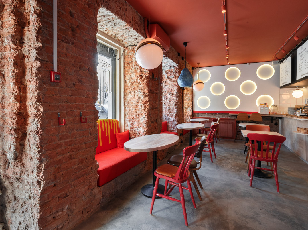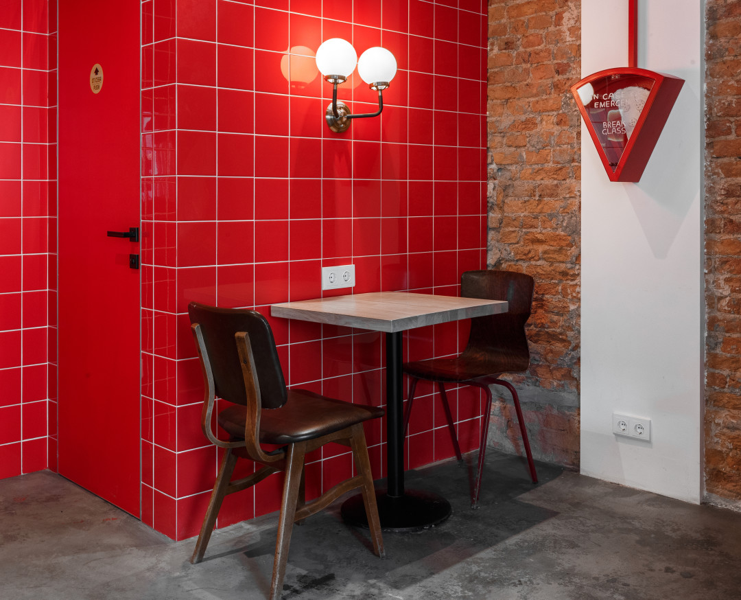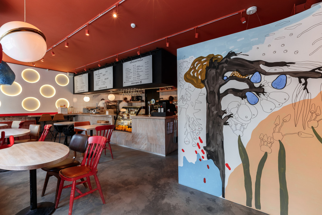Логотип пиццерии разработала студия Артемия Лебедева. А дизайн Pizza Point — Дарья Дурнева, совместившая красную кирпичную кладку и настенную плитку в цвет. Сидеть можно за отдельным столиком или «на диванчиках в окнах» и рассматривать разноформенные, будто космические, подвесные светильники. Встречает гостей расписанная Дарьей ширма, которая иллюстрирует общее настроение гостя от помещения.