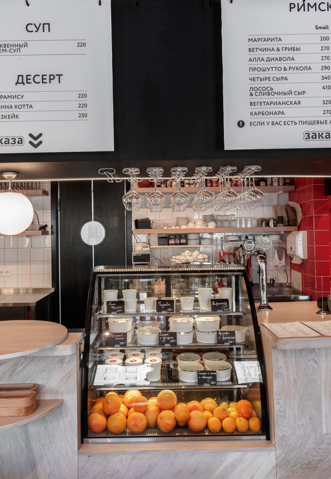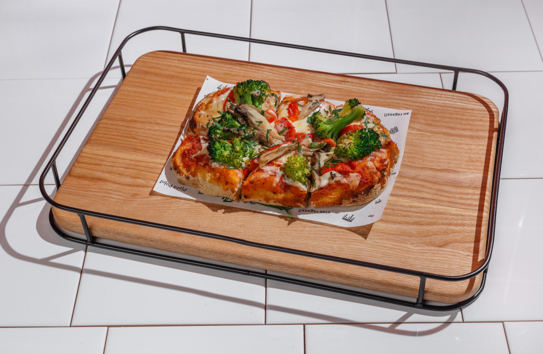 Пойнт — действительно подходящее слово. В маленьком зале, куда разом могут прийти 22 гостя (ладно, могут и больше, но только «с собой»), открытая кухня и витрина с готовой гастрономией — свежие салаты (берем с киноа и авокадо или с тунцом), супы и десерты. В прочем, любое блюдо нужно заказывать у стойки, даже ту самую, очень хрустящую римскую пиццу — заглавное блюдо заведения. Тесто выдерживается от 24 до 48 часов, а сама пицца выпекается в печи в два этапа.