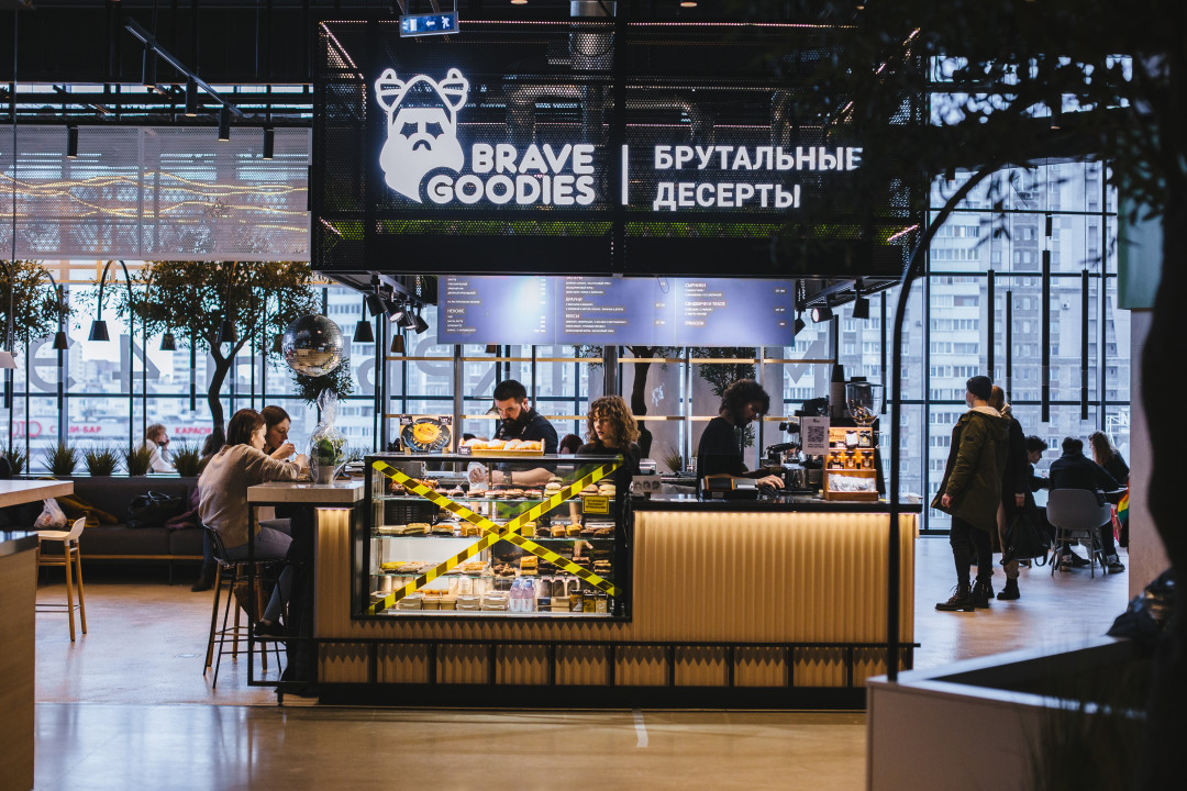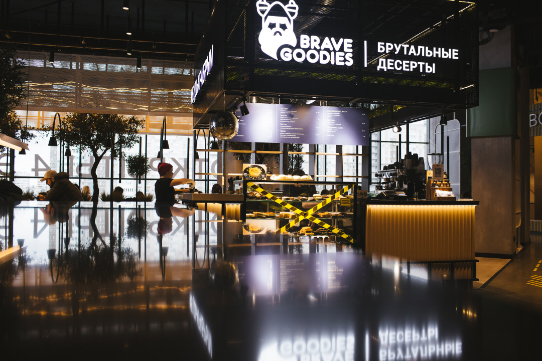 Для меня это первый опыт в построении стационарной офлайн торговой точки. Проект нам делали долго. Ещё дольше мы ждали столешницу из камня. Храбрый ларёк был готов к открытию в октябре, к тому времени частично сняли ограничения на работу фудкортов в ТЦ, и мы стали планировать открытие на 15 ноября — День рождения Brave Goodies. Но 9 числа вышло очередное постановление: фудкорты закроются минимум до середины января. Мы пожали плечами и вернулись на свой заводик, отгружать вагоны булок кофейням. Хочу отдать должное администрации «Сити Молла» за лояльные условия по арендным каникулам и поддержке.
