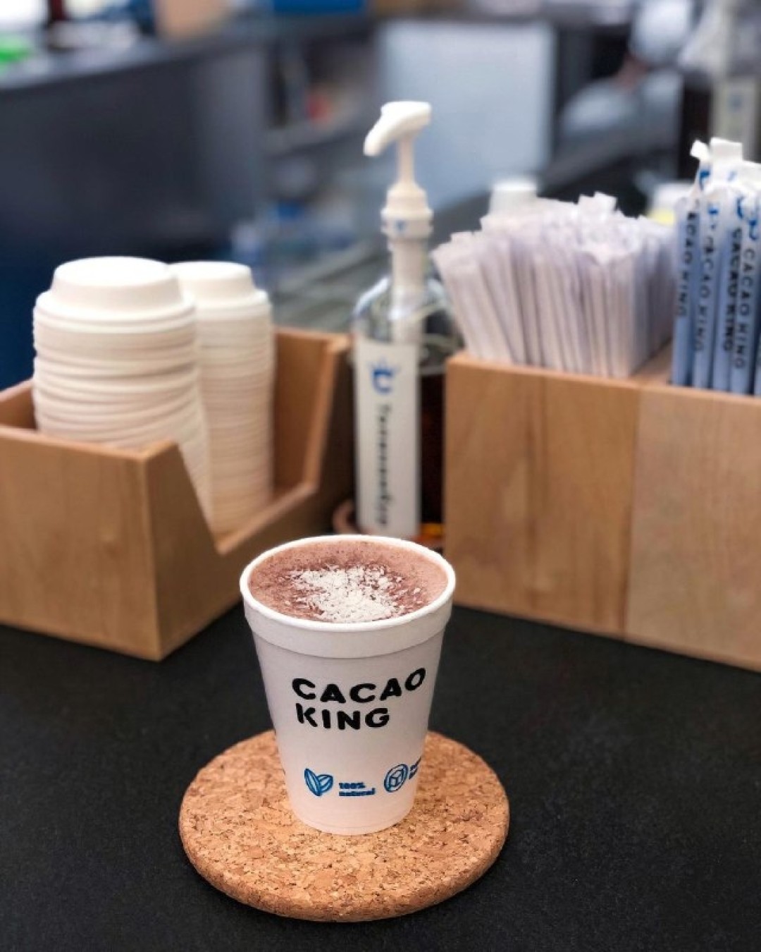 CacaoKing работает на собственном бленде тертого какао из Колумбии. В меню 8 видов напитка: от классического и безлактозного до конопляного, с киноа или ультрапопулярным зеленым чаем матча. Вместо сахара здесь используется только сироп топинамбура.