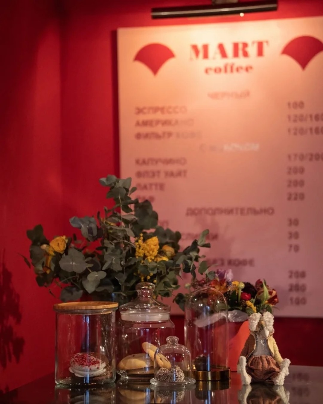 На Большой Пушкарской, 10, открылась миниатюрная дог-френдли кофейня Mart (всего для 5 гостей!) с красными стенами, отсылающими к «Твин Пикс», цветами и спешелти-кофе.