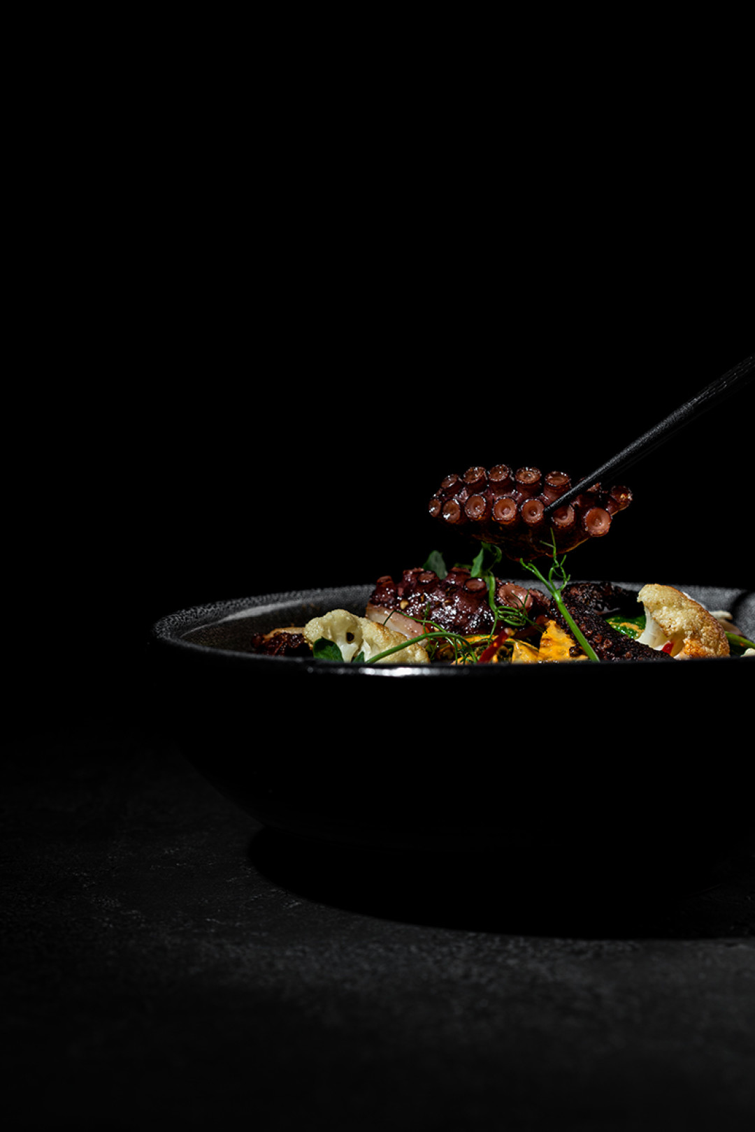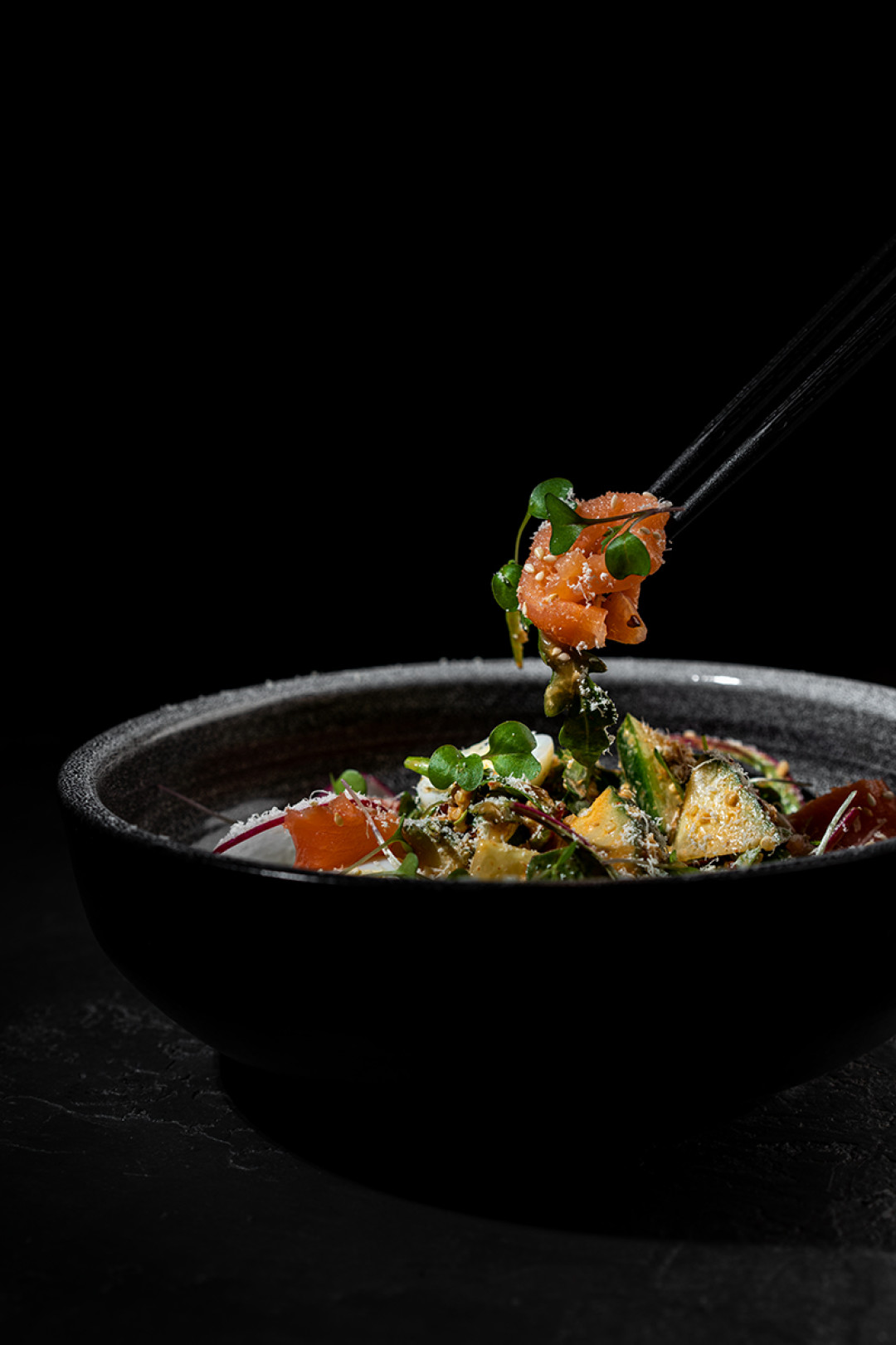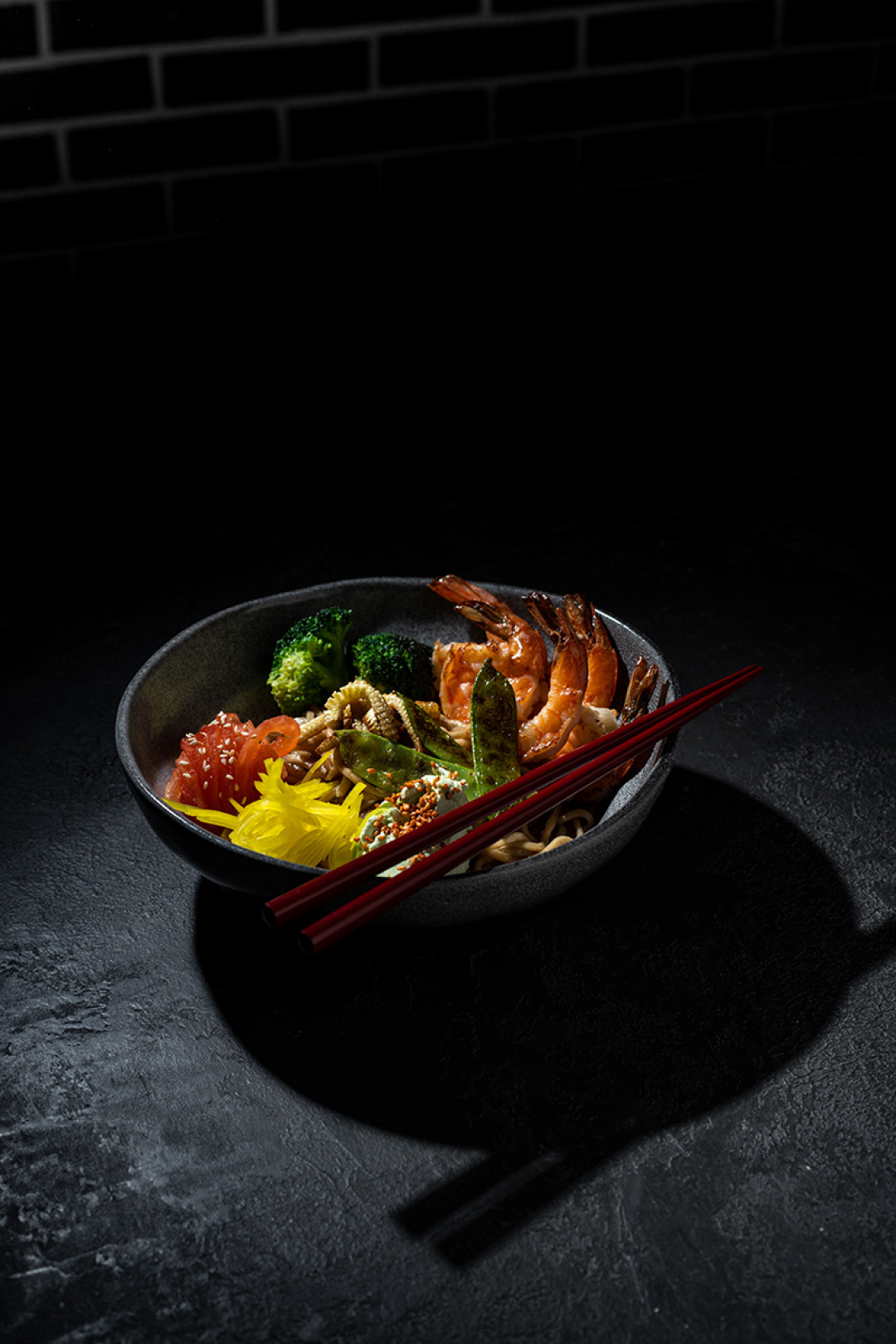 Во главе меню — современная Азия. Рамен с домашней пшеничной лапшой предлагают в 5 исполнениях, в том числе мисо-рамен с курицей карааге (на насыщенном классическом бульоне со свининой и курицей, который варят в течение суток) и вегетарианскую версию — на овощном бульоне с чесночным маслом, дайконом и ростками сои.