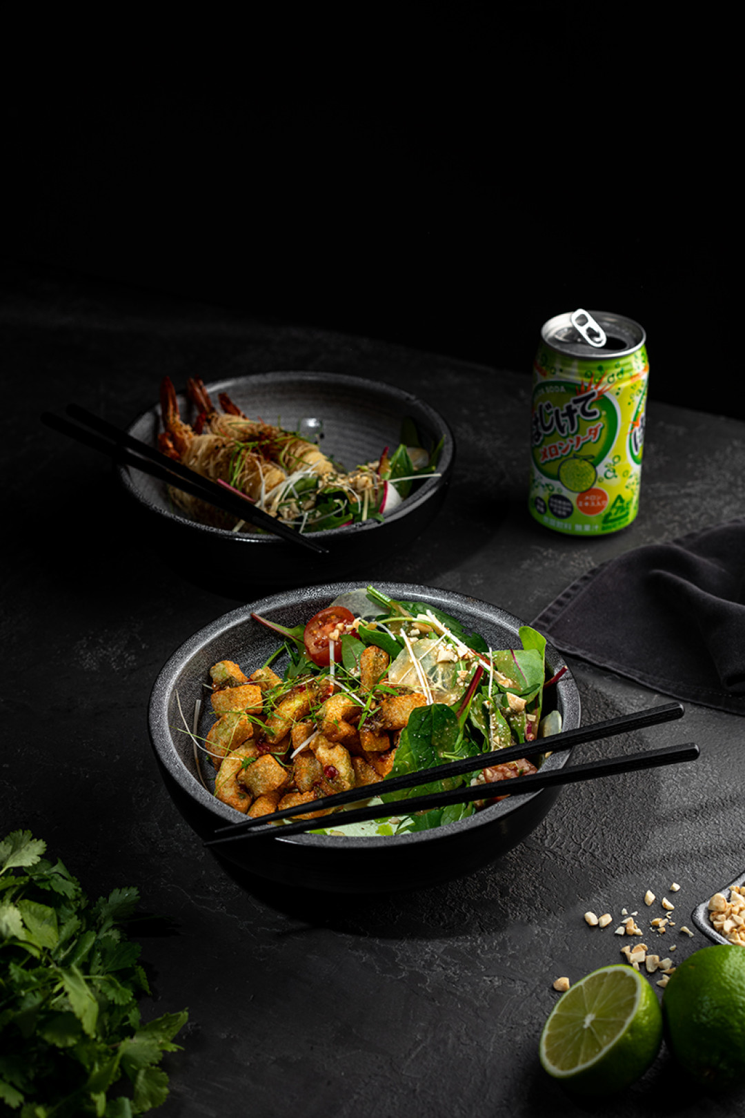 Отдельные разделы предусмотрены под гедза (с треской, креветкой или говядиной) и роллы, авторских версий которых аж целых 7. «Филадельфию» подают с хрустящим воздушным рисом, соусом на основе биска и пряным зеленым маслом из трав, а темпура-ролл с креветкой и тунцом — с маракуйей.