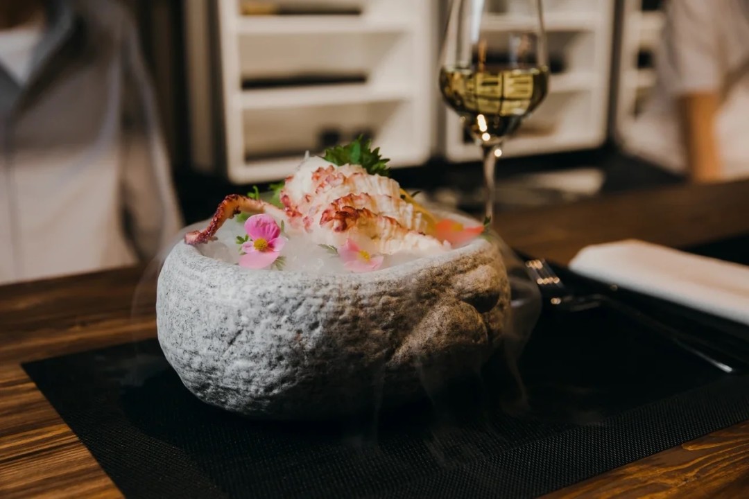 Отдельная карта предназначена для сашими, суши и роллов (на кухне используют рис, выдержанный в черном рисовом уксусе, который усиливает вкус «умами»). Сеты Омакасе, к примеру, готовятся шефом прямо перед гостями: три разных варианта из 13 позиций «Слива», «Бамбук», «Сосна» — в каждом морепродукты и рыба.