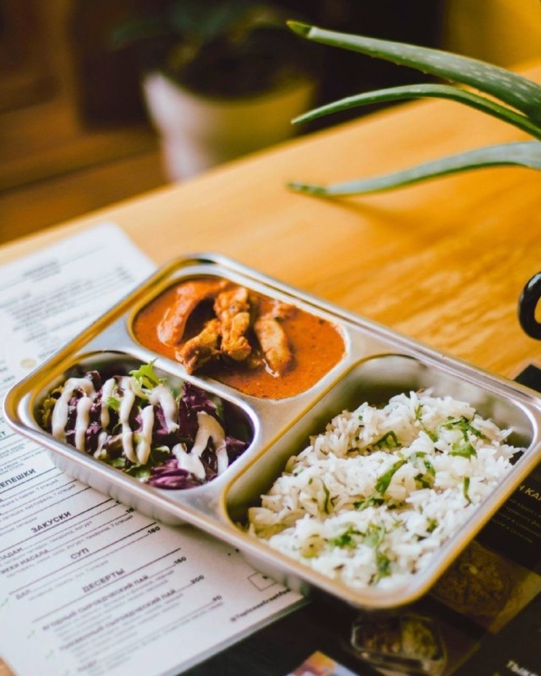 Пока сильные гастроумы ставят на то, что индийская кухня совсем скоро станет сверхвостребованной, на Васильевском острове открылся традиционный индийский стритфуд с расписанными стенами и металлической посудой — все можно унести на одной тарелке. Шуканта Саркар, шеф проекта, адаптировал еду бомбейских улиц под привычную для петербуржцев. Все лепешки делают сами в тандуре и с ними же подают основные блюда: панир парата — пшеничная с начинкой из смеси насыщенных сыров и специй с йогуртовый соусом.