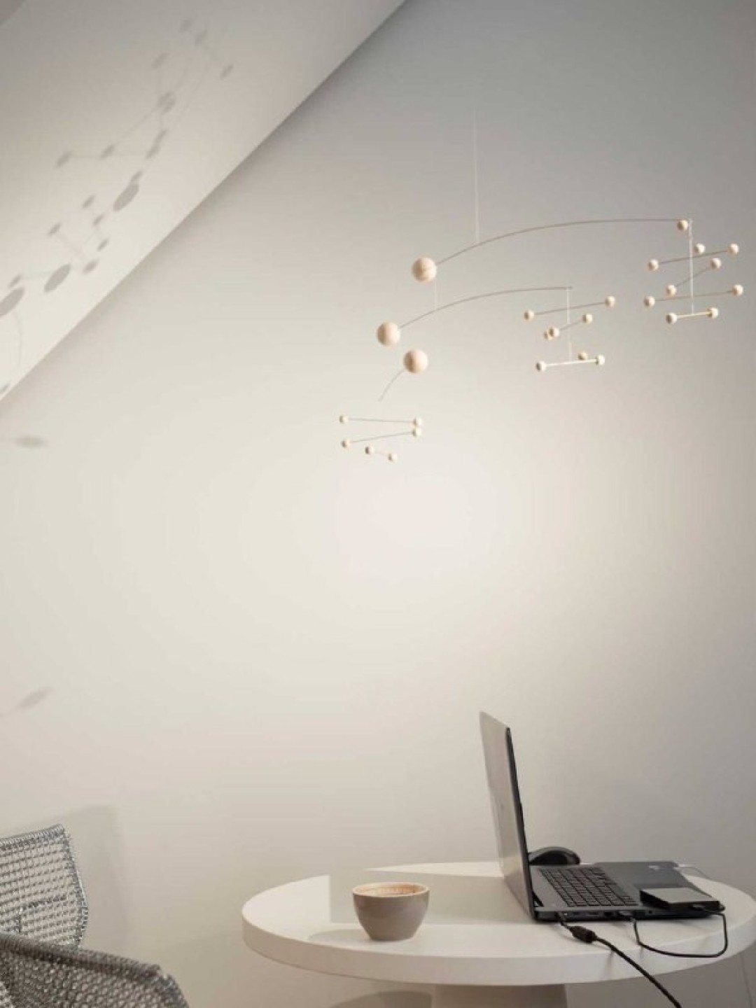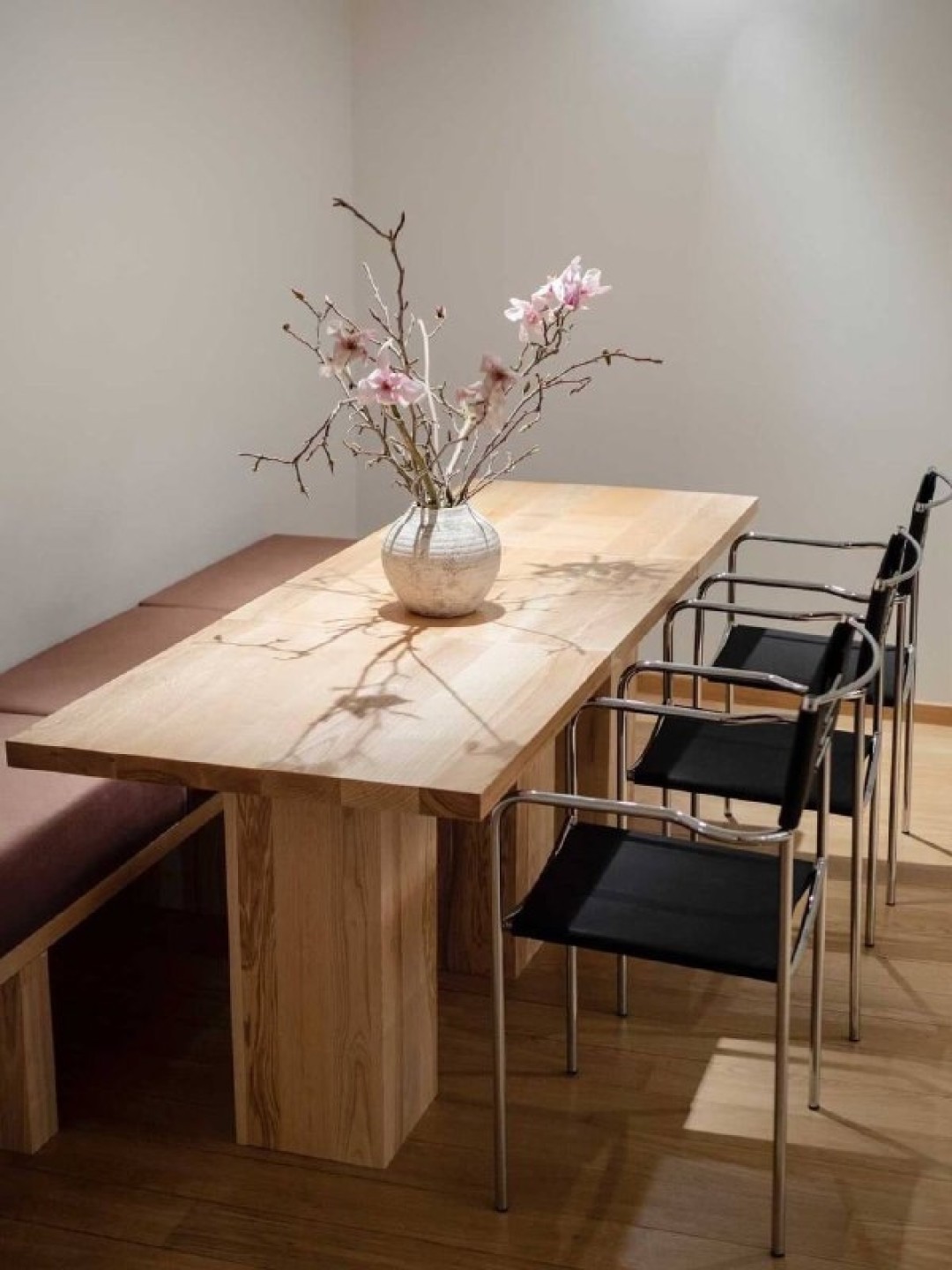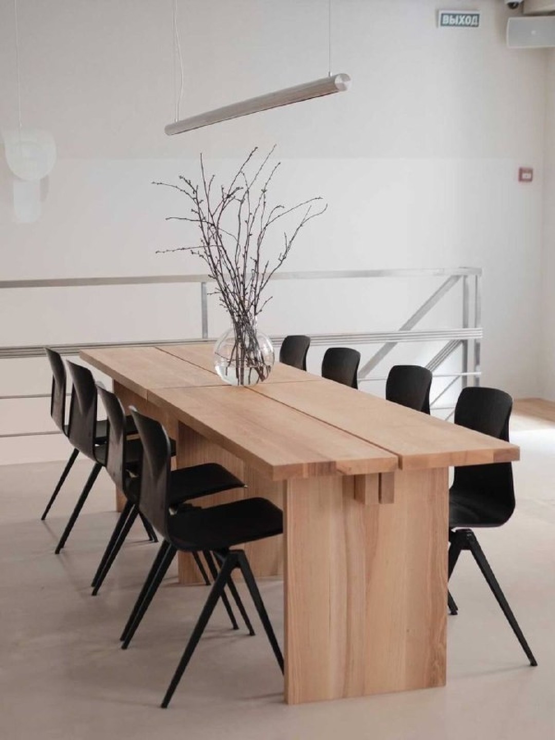 Внутри три зала на 100 человек и минималистичный интерьер: светлые тона, плавные линии, винтажный диван и живое дерево.