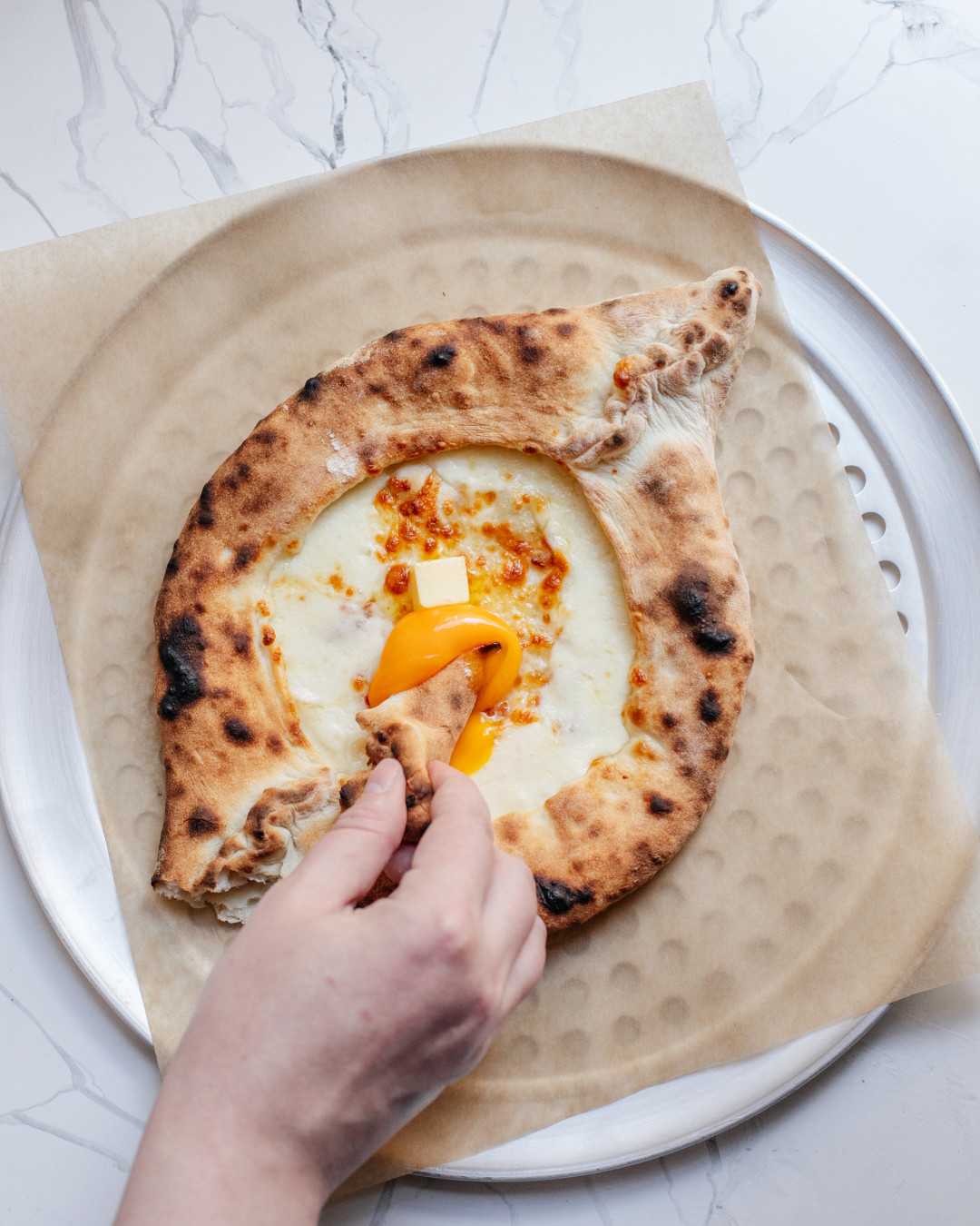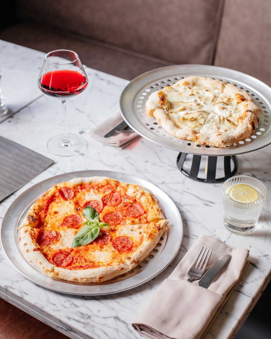 Здесь готовят неаполитанскую пиццу в открытой печи (анчоусы, шпинат и креветки, груша и сыр) и 6 видов хачапури – с креветками и сулугуни, прошутто и даже артишоками с пармезаном. В меню закуски с кальмарами, бурратой и самодельным хлебом, хинкали, запеченный баклажан с