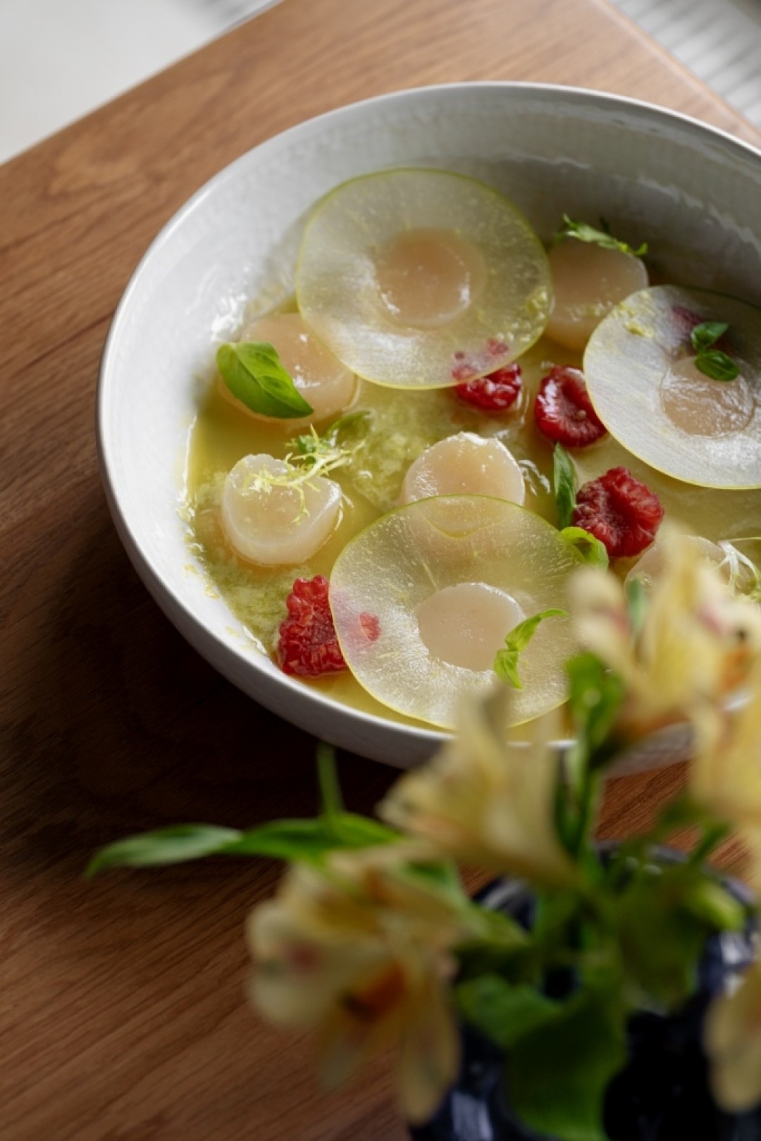 Идеальная закуска к вину – гребешки с малиной и пюре из печеных яблок или тарелка фермерских сыров с абрикосовой горчицей от новоиспеченного сыровара Алексея Феликсова, создателя сети пекарен «Цех 85» и совладельца «585*Золотой». Говорят, что коровы на ферме в Ленобласти – по-настоящему швейцарские!