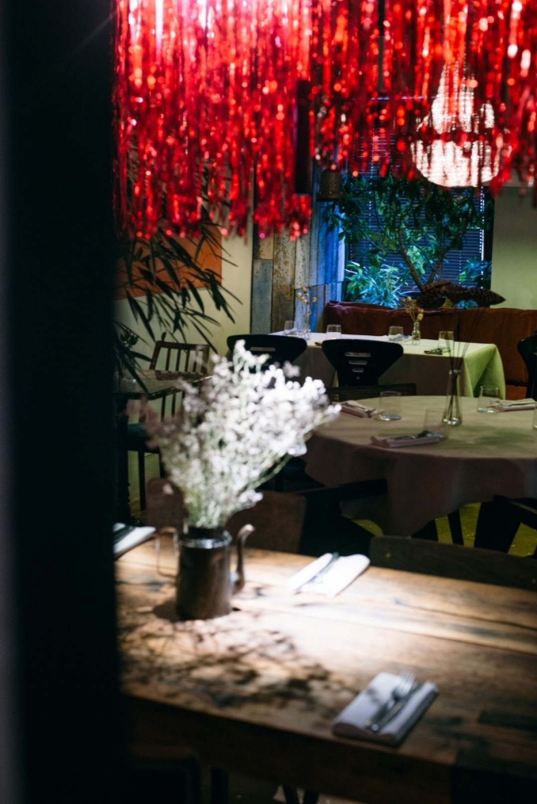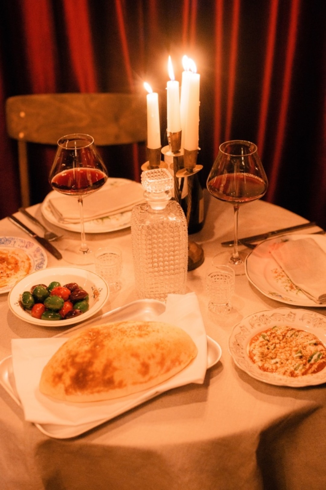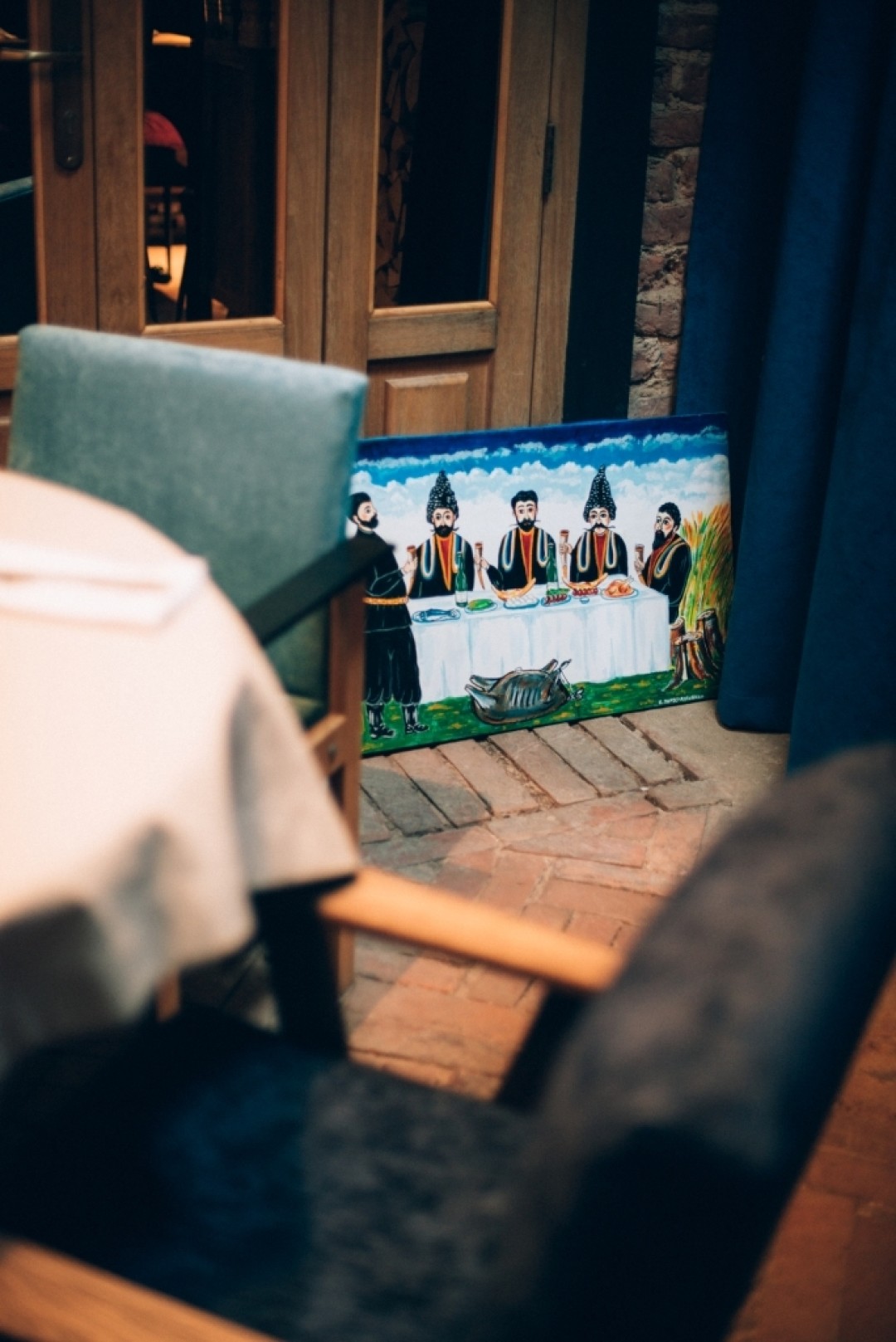 За изумрудной дверью скрывается будто настоящая живая квартира — по-грузински страстная, со своей кухней-гостиной, двором со столетней виноградной лозой и застекленной «театральной» верандой с тяжелыми бордовыми портьерами, изящными люстрами и видом на расписанный петербургский двор-колодец. Из каждого помещения ваш глаз будет уходить последним — то заглядываясь на стекающий к фортепиано свечной воск, то на алый «дождик» под потолком.