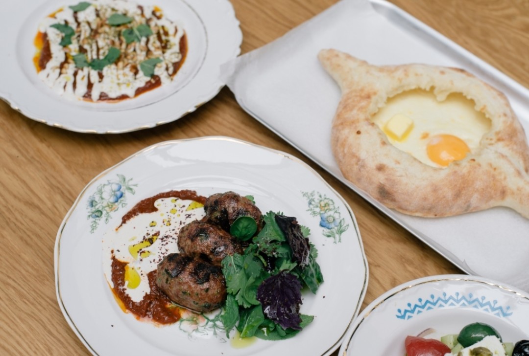 Шеф-повар Никита Лопатин (также отвечает за кухню Jungle) включил в меню классические блюда Грузии, Греции и Ближнего Востока. На старт — пышущая жаром лепешка и выбор из 5 намазок: хумус, тхина и матбуха, дзадзики, крем из баклажанов и тирокафтери — зверь из печеных перцев рамиро и йогурта. Чтобы почувствовать культурную разницу берем грузинский и греческий салаты. Сладкие узбекские томаты, зелень и понятные отличия в виде фермеской феты и заправок — свой авторский «тач» блюдам шеф добавляет точно химическими соединениями специй.
