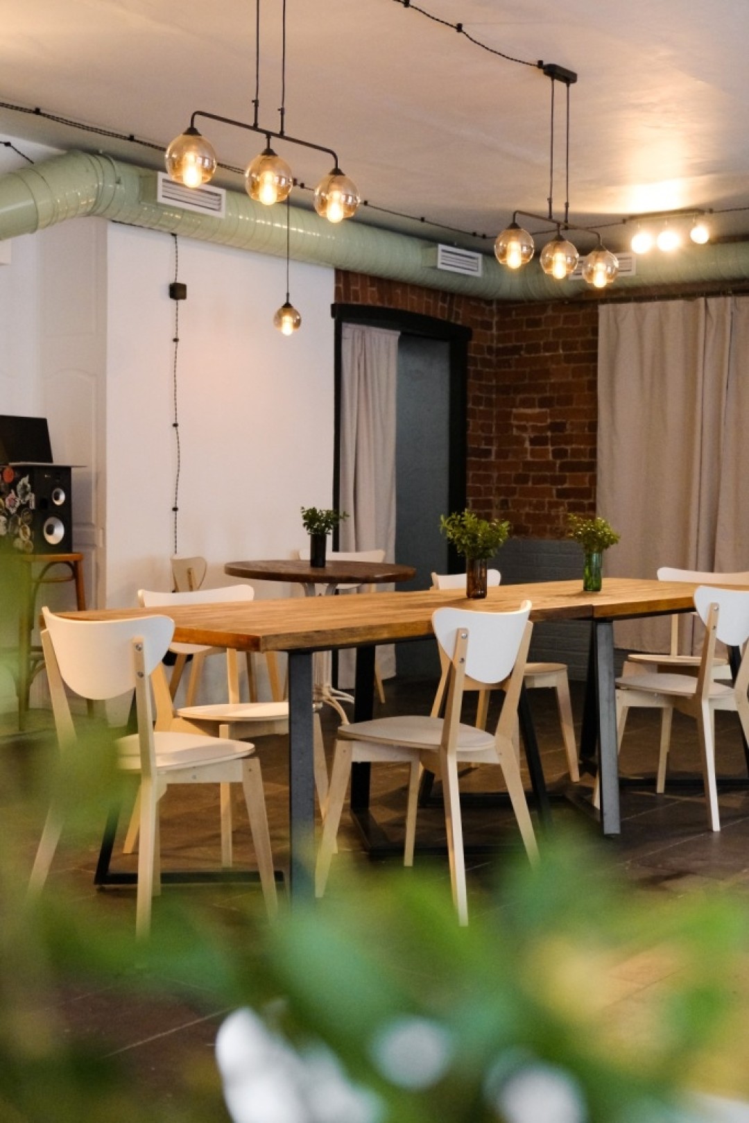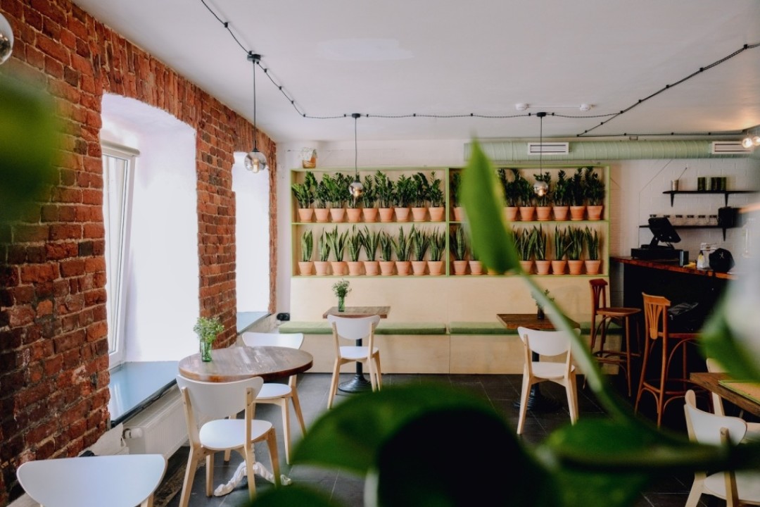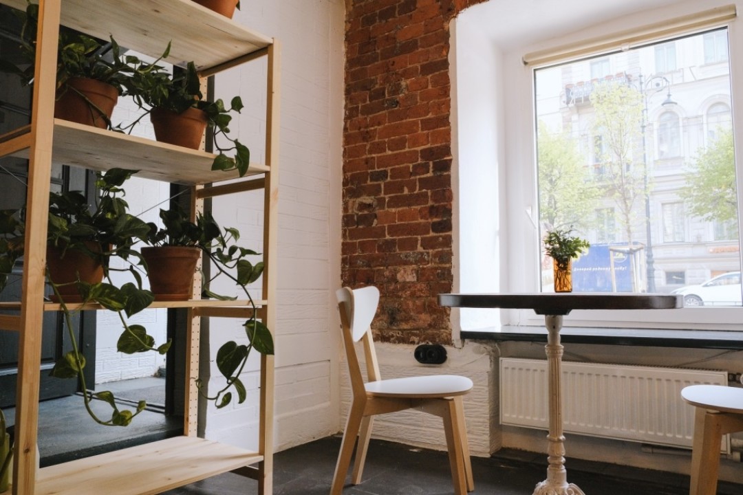 Внутри помещения много света (три больших окна, на которых тоже можно расположиться), нейтральные цвета, кирпичная кладка, текущая светло-зеленая труба под потолком и стена живых растений.