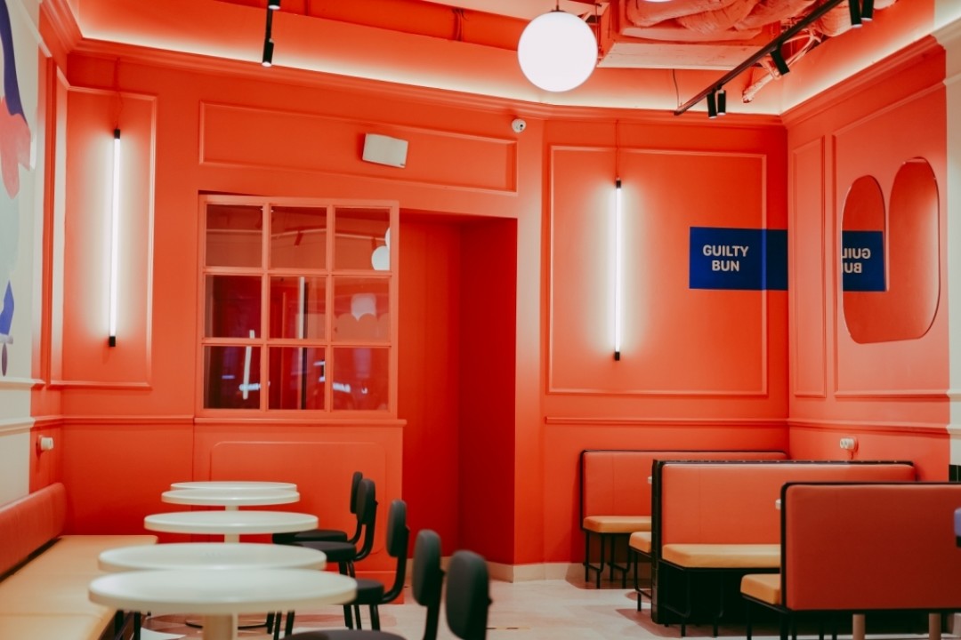 Помещение, где раньше размещались пекарни «Коржов» и Central bakery, оформляли дизайнеры Элина Гомберг и Анна Окорокова. Здесь предусмотрено с десяток ракурсов для фото на фоне алых стен, белой или изумрудной плитки, вручную отрисованной девочки на скейте и неонового знамени «guilty pleasure». Вообще, светящихся вывесок по периметру несколько и одна из них точно попадет в ваш инстаграм.