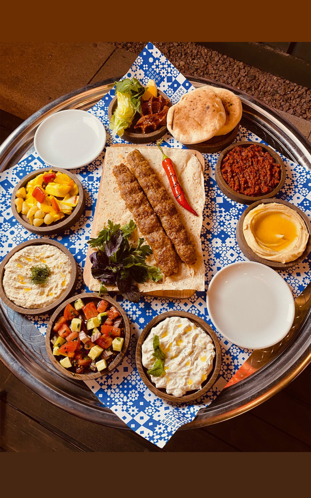 В Новой Голландии этим летом появился редкий турецкий поп-ап от команды Bekitzer: уличное кафе с пестрым навесом и аутентичными фонариками, специально для которого пригласили шефа Семиха Йигита из древнего города Кютахья. Заказываем метровый поднос с кебабами из баранины или телятины и все мезе: чи-кефте, аджалиезме, хумусом, дзадзики и торши.