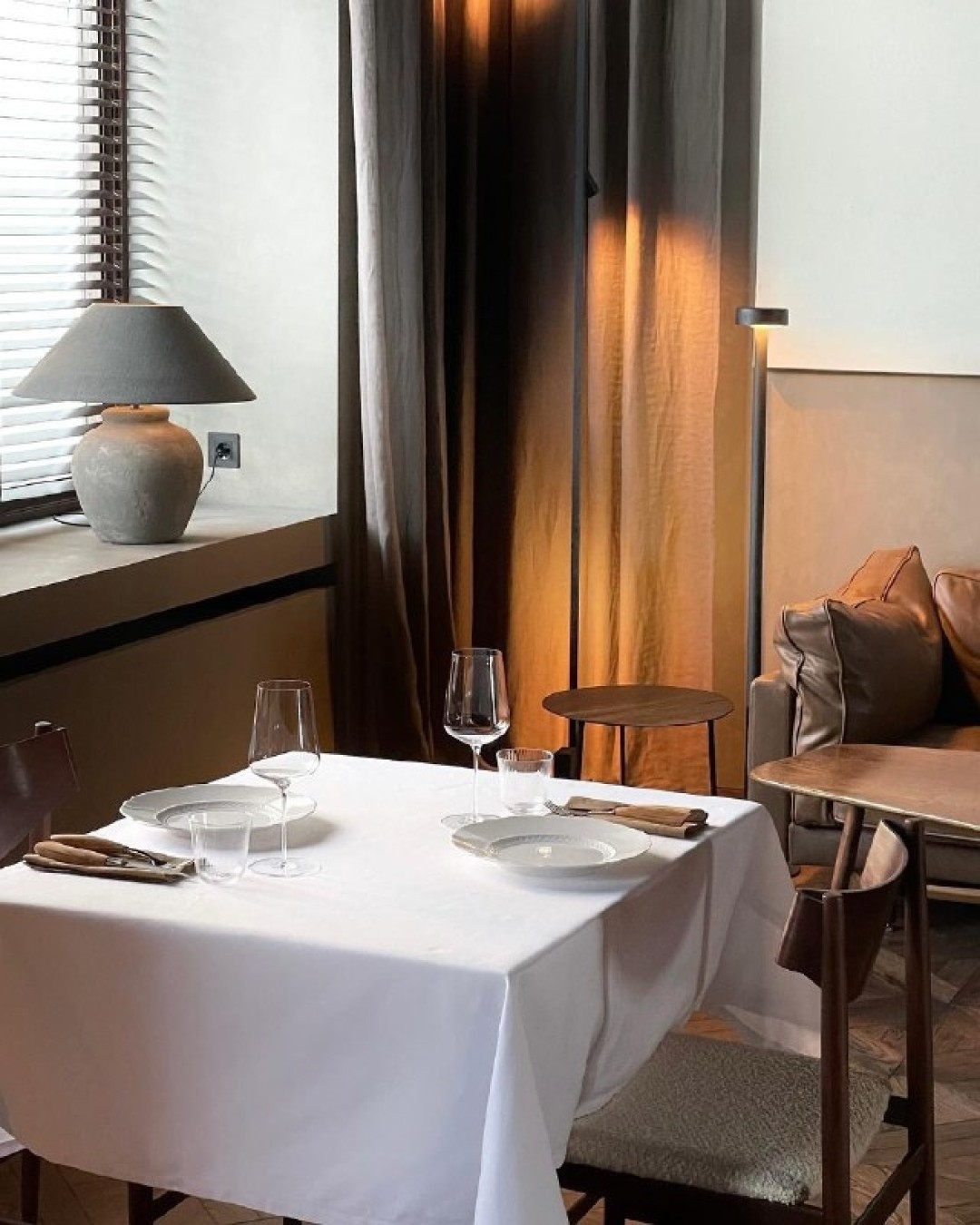 Не стесняйтесь прийти заранее назначенного с друзьями времени ужина – вас проведут к низкому дивану, за которым можно подождать остальных, предложат снэк, аперитивный коктейль и бокал вина. Все заведение рассчитано на 45 гостей – часть столов покрыта белыми скатертями, а часть нет.