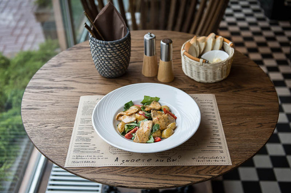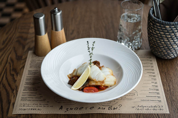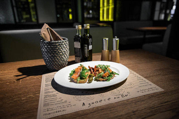 Меню небольшое и состоит из разумного количества позиций. Теплый салат из индейки с кислым щавелем и тушеным мясным соком сочен и свеж, но лишен искрометной идеи и яркого сочетания текстур. В том ям кунг, кроме креветок, добавляют еще молочные сливки, что делает его аккуратной и скучноватой адаптацией. Еще есть стейки и конечно, те самые виды рыб, которые вроде трех китов городского общепита — палтус, лосось и дорада. Последнюю, кроме гриля, еще предлагают на азиатский манер зажарить во фритюре. Приносят ее вместе с мелко порубленным чили, лаймом и красным луком, почему-то в совершенно пресной пропорции. Есть еще брускетты с моццарелой, грибной икрой и лососем, больше похожие на бутерброды в новорусском стиле.