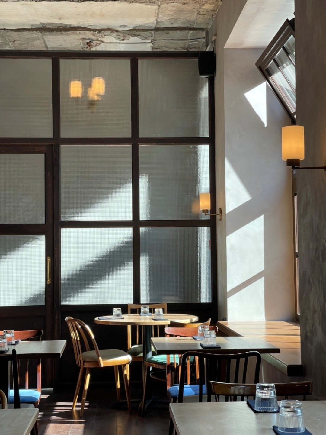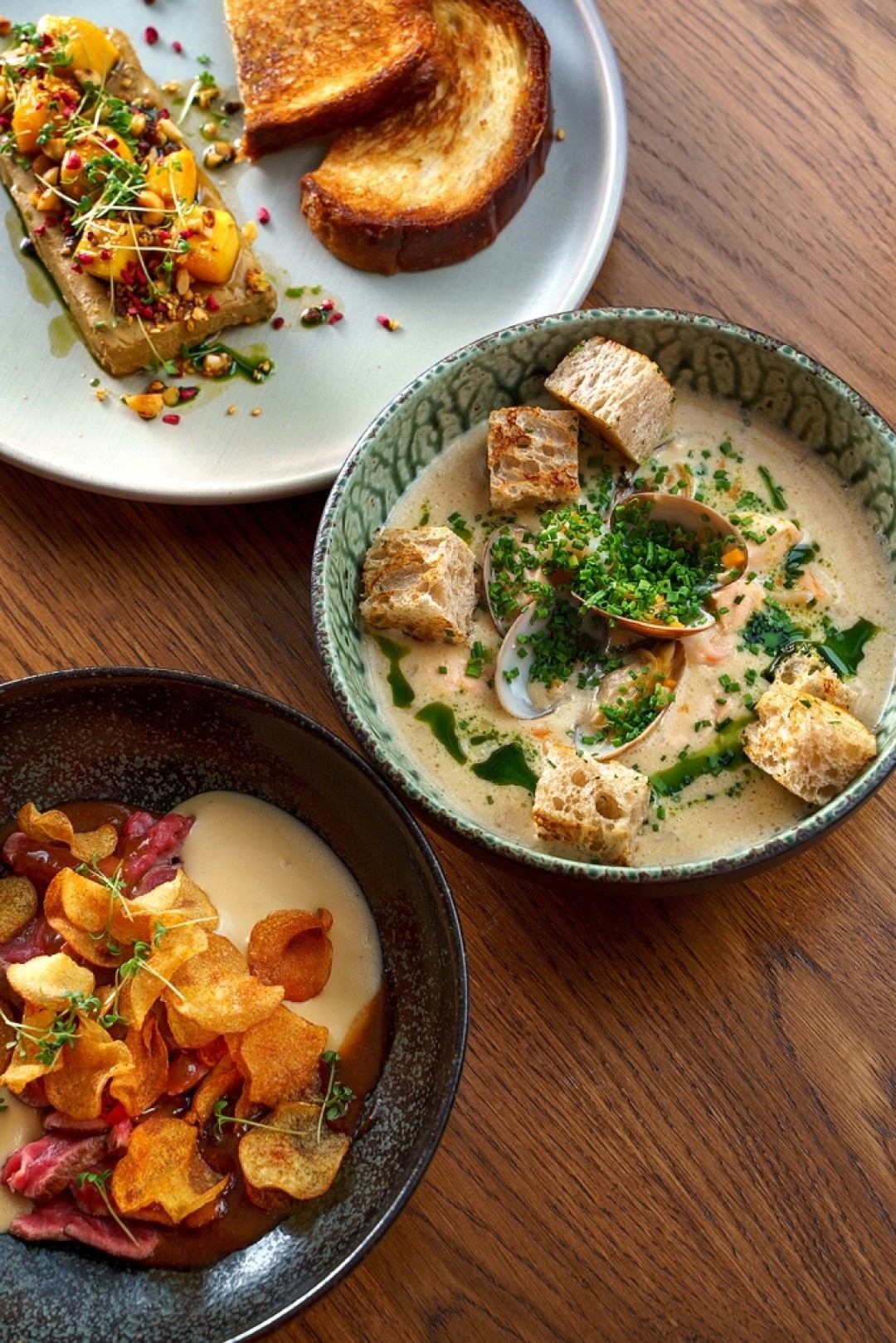 Меню открывается хрестоматийным «футуровским» хлебом, а дальше – закуски вроде гуакамоле (здесь он бодрый, в меру пикантный и очень свежий), куриного паштета с персиками или севиче из тунца (must try!). Фотогеничный сливочный клэм-чаудер с моллюсками подают с гренками, треску – с капустой, подрумяненной в хоспере, а в хот-дог закладывают сочную сырную сосиску.
