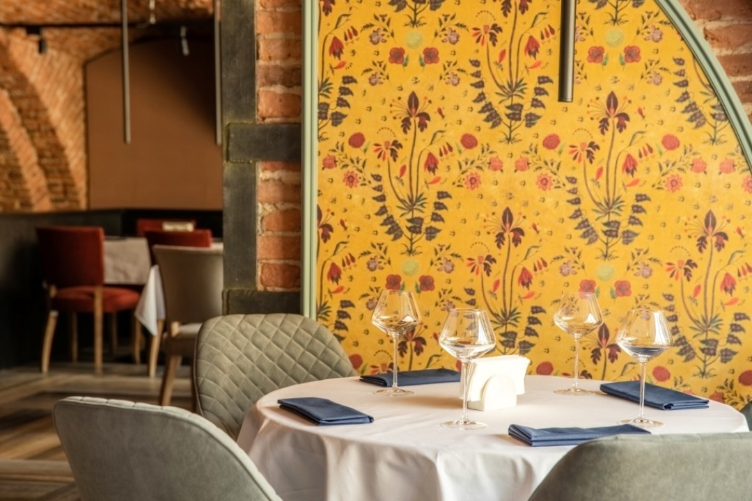 Это двухэтажное заведение с открытой кухней и баром. В интерьере использованы спокойные пыльно-голубые и землисто-зеленые оттенки с терракотовыми вкраплениями. Вокруг дерево, изразцы, латунь и камень.
