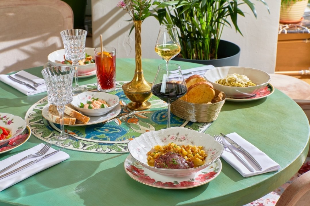 В интерьере использовали много дерева, камня и зелени. Столы украшают расписные скатерти и винтажная посуда.