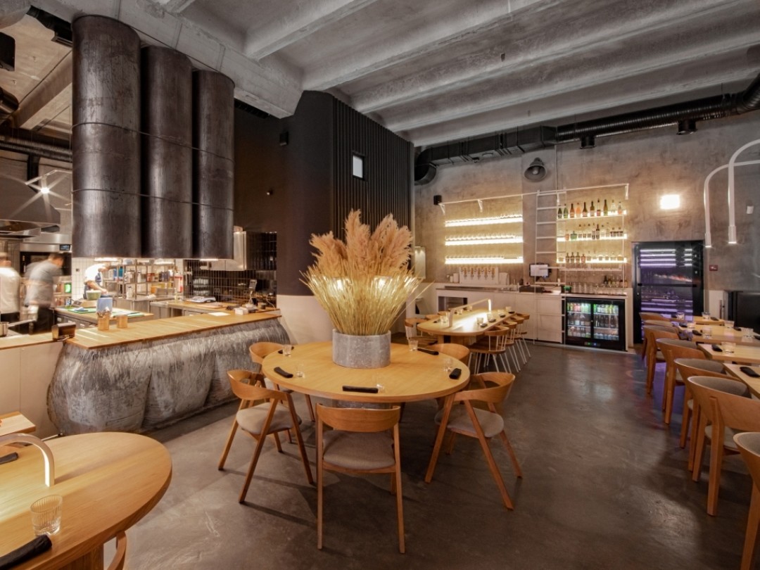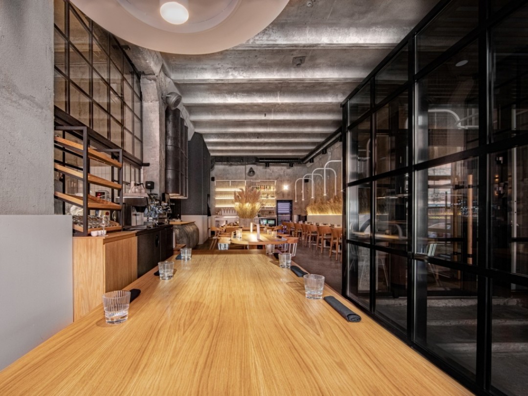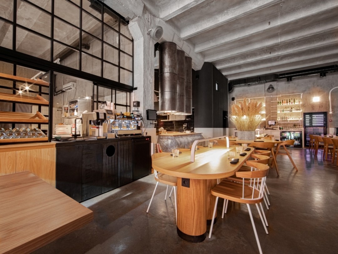 Когда-то помещение бистро занимало заводское бетонное пространство с высокими потолками и сеткой колонн. Оформлявший интерьер бистро Максим Цыбин (бюро TSAN Architects) хотел сохранить текущее состояние, наполнив его элементами индустриального быта.