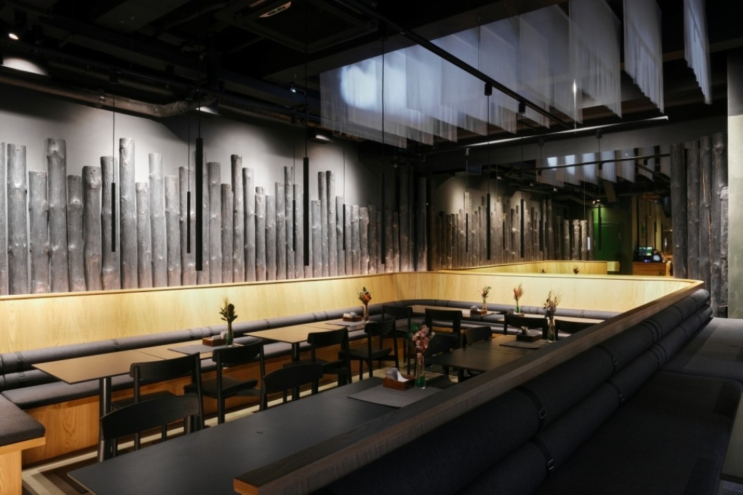 В интерьере также отображена тема природы. Само пространство оформлено в глубоких зеленых тонах, на стенах — опаленные бревна, рядом с панорамным окном — старинная водопроводная труба и стабилизированный мох, а под потолком расположена инсталляция — это проекция теней деревьев на специальные полотна.